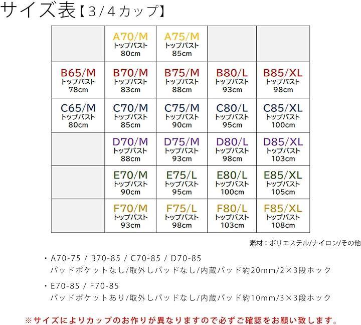 「特徴」(全サイズ共通)ストラップ調整可・取り外し可/ワイヤーあり/サイドボーンあり/伸縮性・通気性あり (A-Dサイズ)内蔵パッドあり/パッドポケットなし (EFサイズ)内蔵パッドあり/パッドポケットあり/取り外しパッド付
