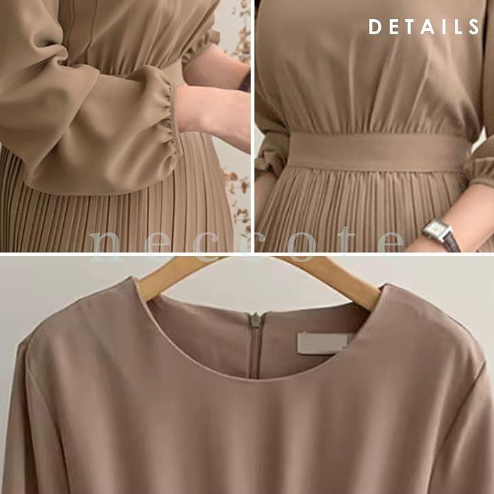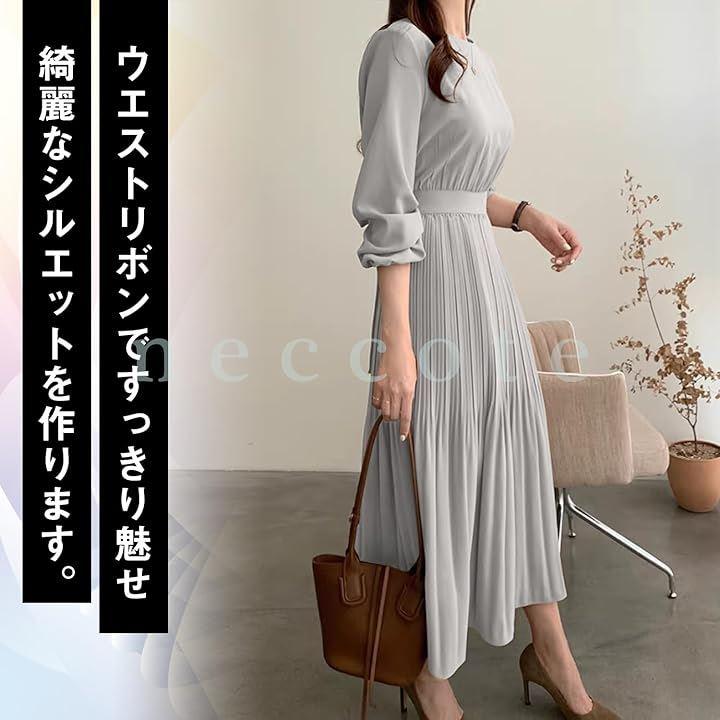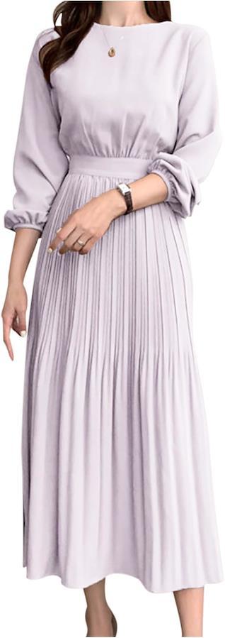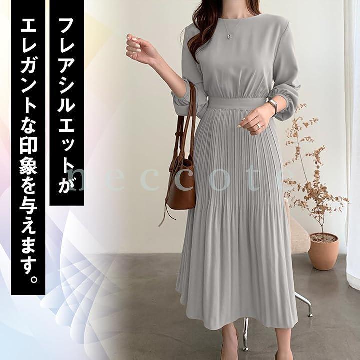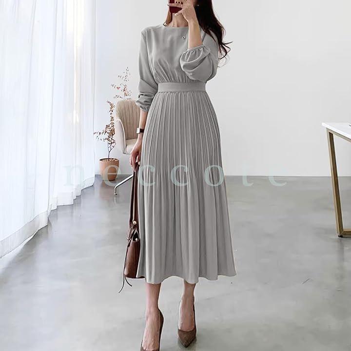 レディース ワンピース ドレス プリーツ クラシカル 長袖 パーティ 無地 ロング丈 大人 オフィス 春 秋 冬 NC405GYXL