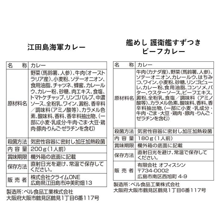 【江田島海軍カレー】野菜(馬鈴薯、人参)、牛肉(オーストラリア産)、小麦粉、ソテーオニオン、食用油脂、チャツネ、蜂蜜、カレールウ、カレー粉、砂糖、肉エキス、食塩、トマトケチャップ、リンゴパルプ、中濃ソース、全粉乳、ワイン、澱粉、香辛料/調味料(アミノ酸等)、カラメル色素、酸味料、香料、香辛料抽出物、(一部に小麦・乳成分・牛肉・ごま・大豆・鶏肉・豚肉・りんご・ゼラチンを含む)【艦めし護衛艦すずつきビーフカレー】牛肉(カナダ産)、野菜(馬鈴薯、人参)、ソテーオニオン(玉葱、食用油脂)、カレールウ(小麦粉、食用油脂、食塩、香辛料、砂糖、その他)、はちみつ、ワイン、小麦粉、砂糖、リンゴピューレ、カレー粉、食用油脂、コンソメ、バター、ウスターソース、ビーフエキス、澱粉、全粉乳、食塩/調味料(アミノ酸等)、カラメル色素、酸味料、香料、香辛料抽出物、(一部に小麦・乳成分・牛肉・ごま・大豆・鶏肉・豚肉・りんご・ ゼラチンを含む)