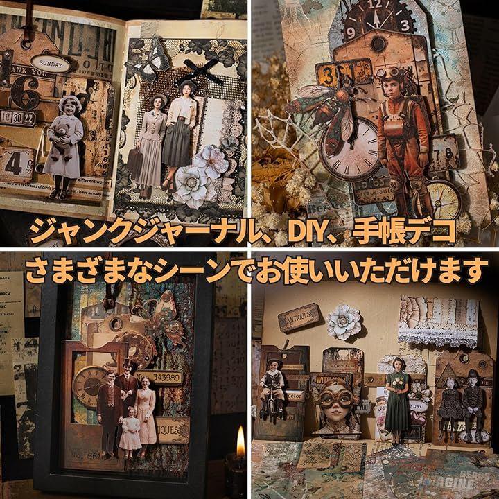 まるで古書から切り取られたかのようなヴィンテージ風の人物イラスト、繊細な花や葉のモチーフ、古びたタグ、レース模様、そして手書き風の英字など、ノスタルジックなモチーフが豊富に揃っています。