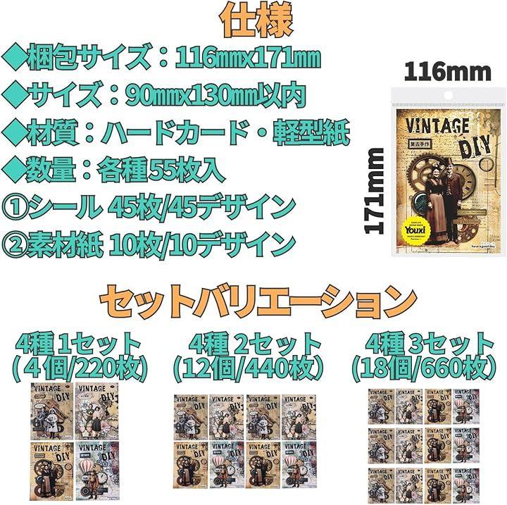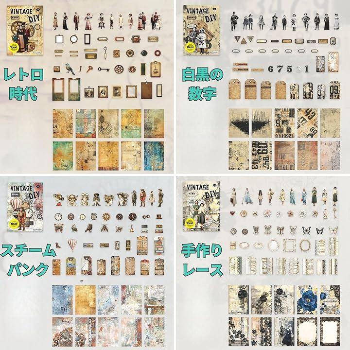 「仕様」1セッ225枚(4種x55枚 (1)シール45枚/45デザイン (2)素材紙10枚/10デザイン)) [レトロ時代(复古时代)] [白黒の数字(黒白数字)] [スチームパンク(蒸汽朋克)] [手作りレース(手工蕾丝)]