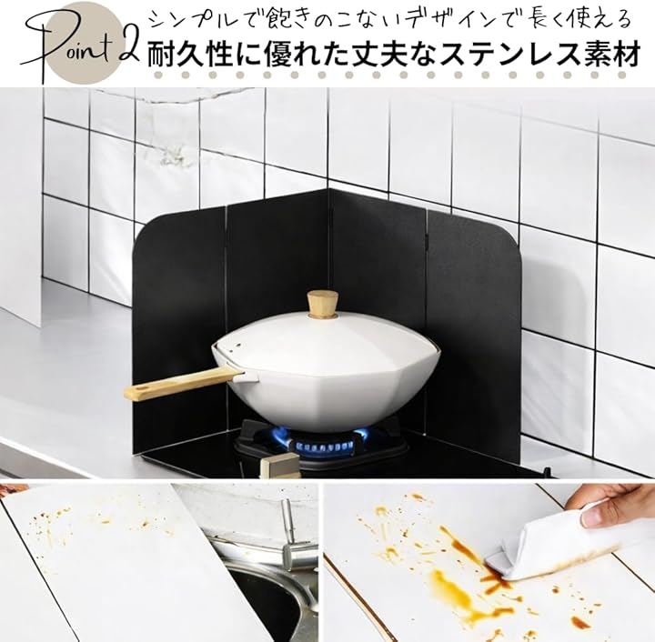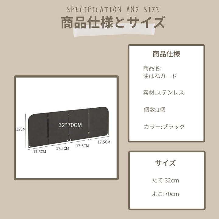 「商品仕様」商品名:油はねガード 素材:ステンレス鋼 サイズ:横70cm x 縦32cm カラー:ブラック 個数:1個