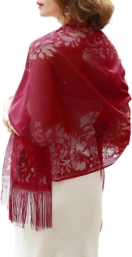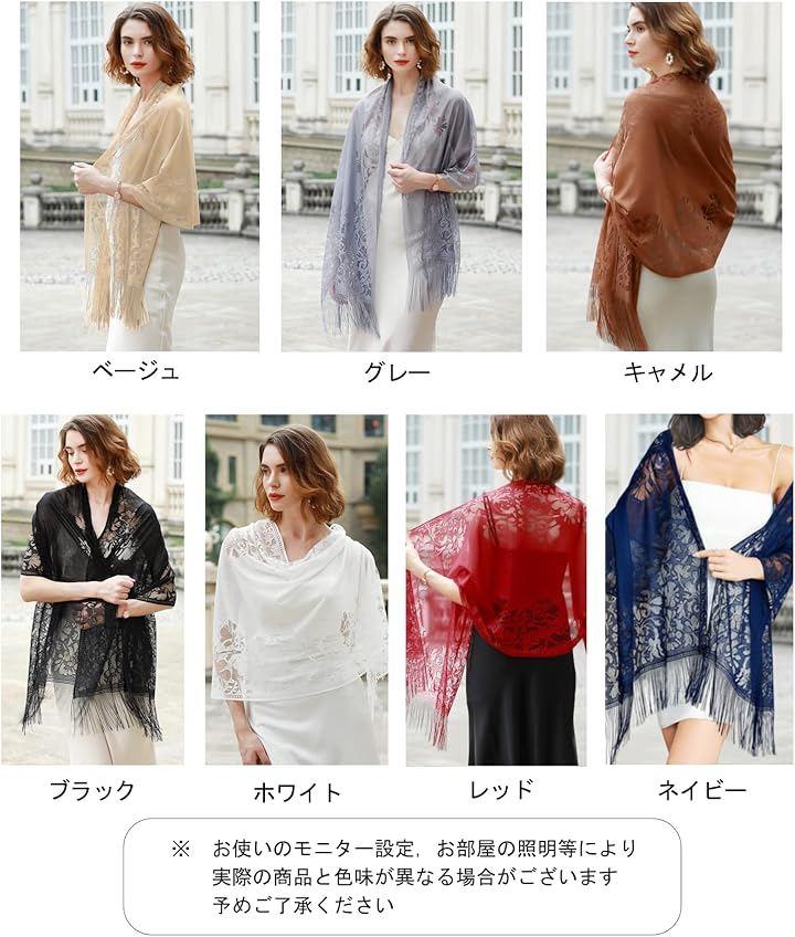 「頼れる高見えストール」繊細なレースと上品な光沢が高級感を醸し出し、お値段以上に見えると評判です。