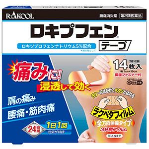 ■商品概要メーカー:ラクール薬品商品名:ロキプフェンテープ 14枚医薬品分類:第2類医薬品区分:OTC医薬品小児用区分:大人用(大人(15歳以上)の用量・用法しかない)薬剤形状:湿布・絆創膏内容量:14枚商品概要:腰痛、肩こりに伴う肩の痛み、関節痛、筋肉痛、腱鞘炎に【使用期限】出荷時点で使用期限終了まで1年以上JANコード:4987435556035商品コード:021401748
