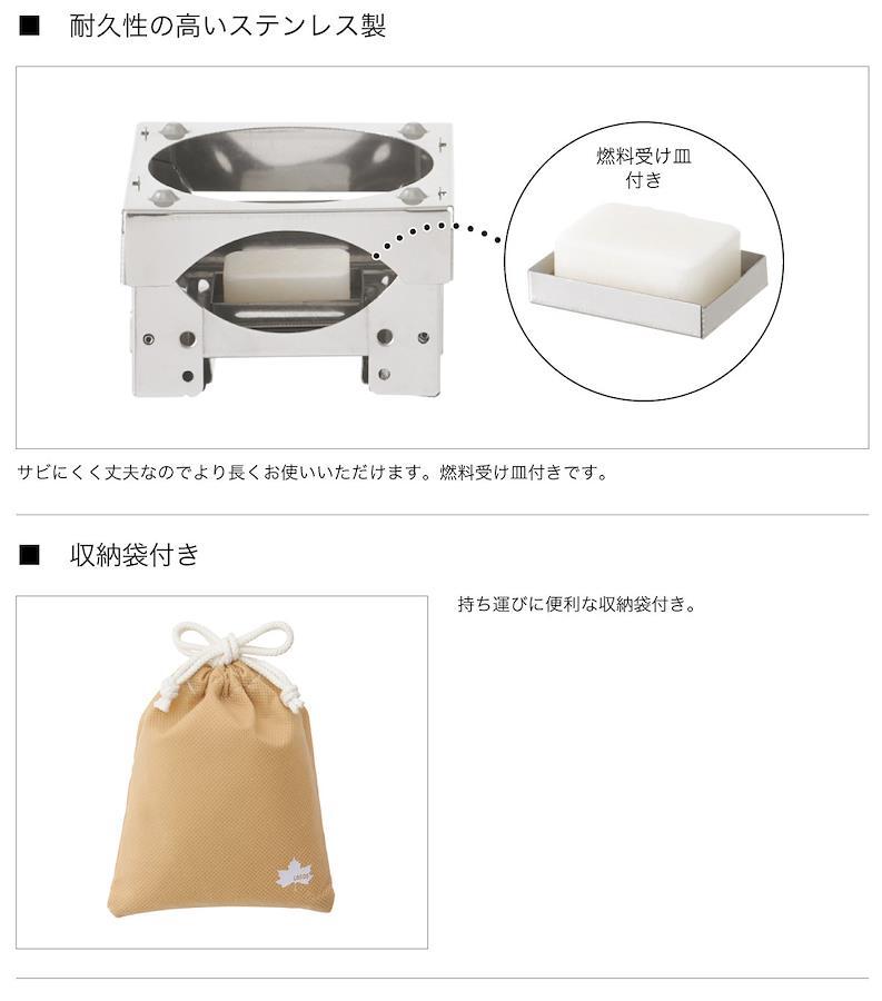 総重量:(約)160gサイズ:(約)8.6×8.6×5.5cm収納サイズ:(約)8.6×8.6×2.5cm構成:コンロ本体、燃料受け皿主素材:ステンレスポケットサイズのコンパクトコンロ。耐久性の高いステンレス製。燃料は別売の専用燃料(No.83010109タブレット燃料)をご使用ください。※付属はしていません。別売専用燃料はコンロ内部に収納できます。