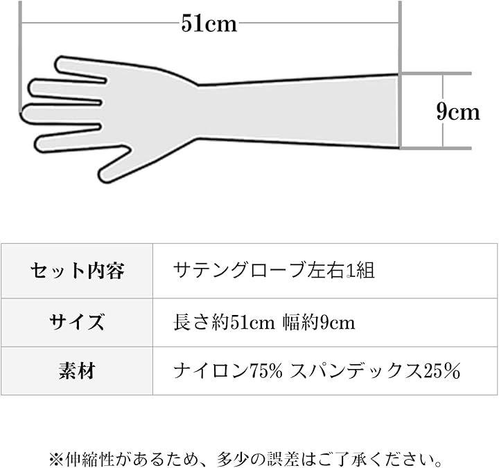 セット内容:サテングローブ左右1組 サイズ:長さ約51cm、幅約9cm 素材:ナイロン75% スパンデックス25% *伸縮性があるため、多少の誤差はご了承ください。