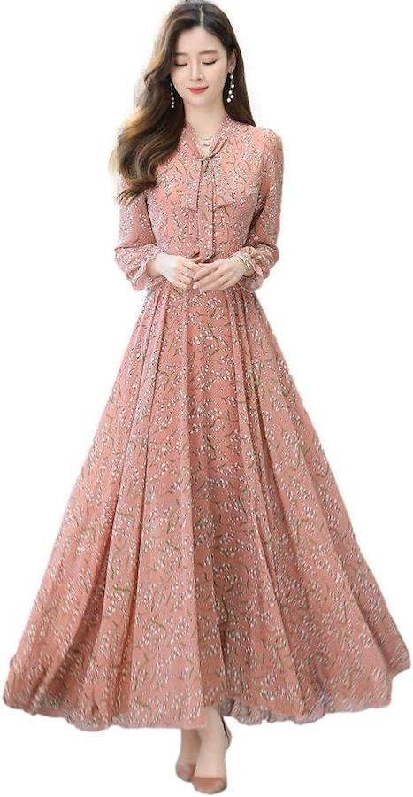 柔らかく繊細なシフォンが揺れるフレアーロングワンピース。