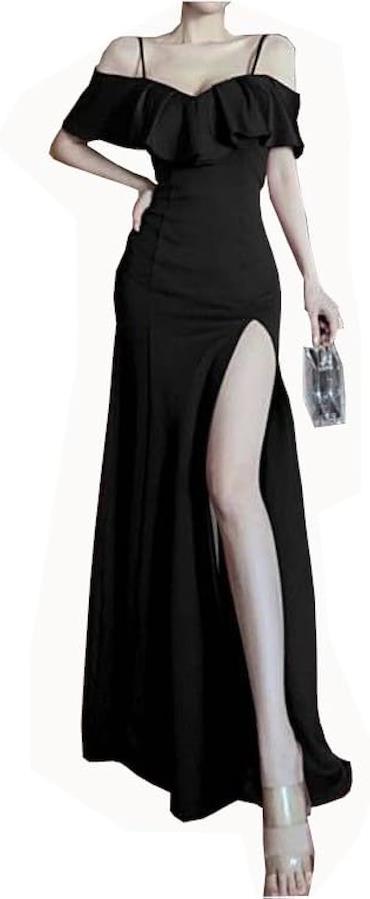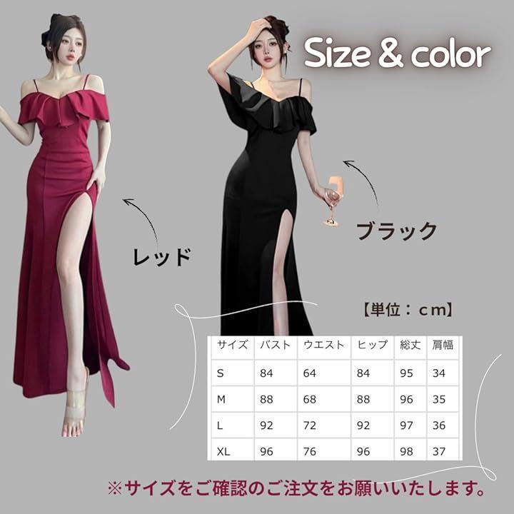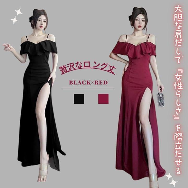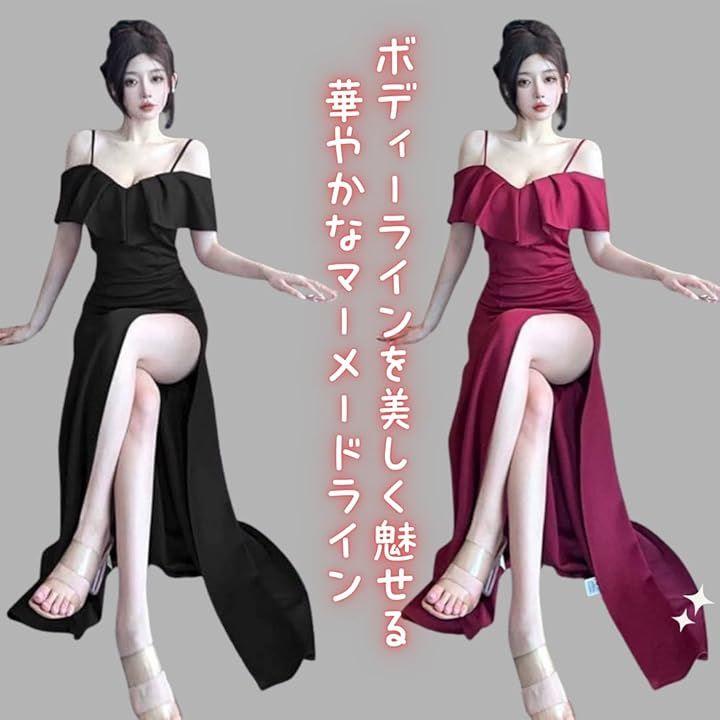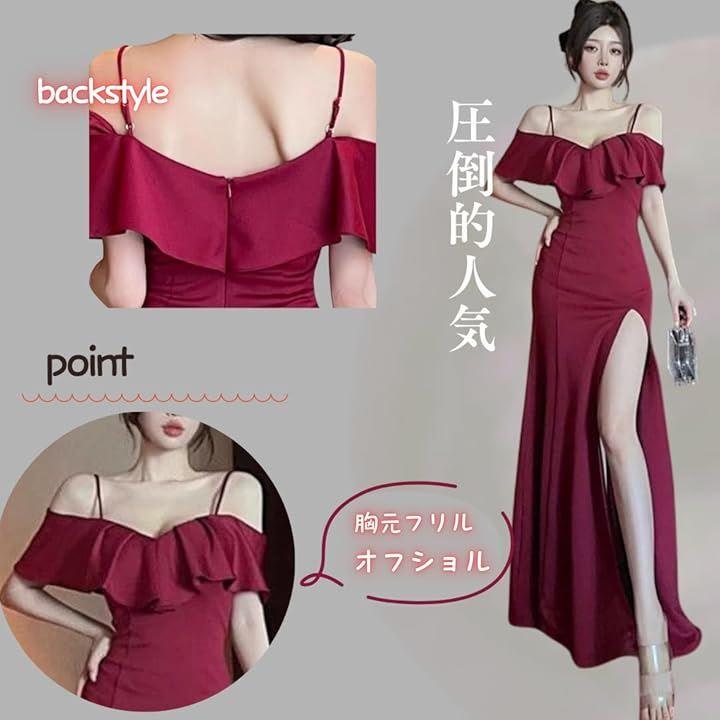 《マキシ丈のロングワンピース》 大胆な肩出しデザインで女性らしいセクシーな肩と背中を際立たせ、優雅で魅力的なラインを強調します。