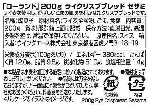 内容量:200gカロリー:357Kcal/100g原材料:ライ麦全粒粉,胡麻,食塩商品サイズ(幅×奥行×高さ):75×145×120mm【重要】メーカーによる商品リニューアルに伴いパッケージ(内容量も含む)変更が行われた場合、新パッケージでお届け致します事ご了承願います。