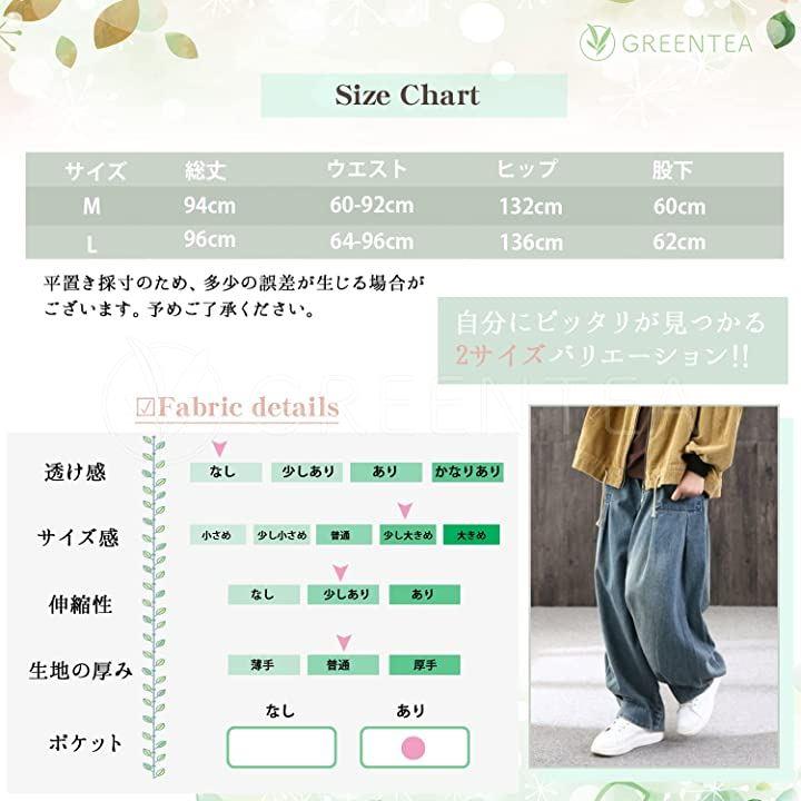 Mサイズ:総丈/94 ウエスト/60-92 ヒップ/132 股下/60 Lサイズ:総丈/96 ウエスト/64-96 ヒップ/136 股下/62