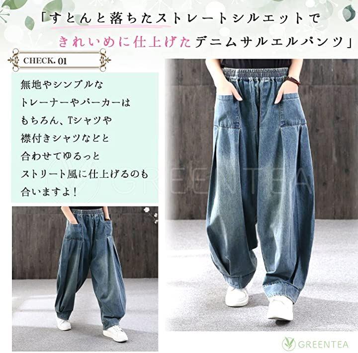 ・すとんと落ちたストレートシルエットできれいめに仕上げたデニムサルエルパンツ。