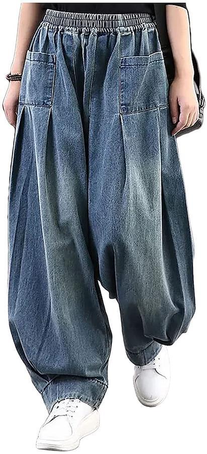 すとんと落ちたストレートシルエットできれいめに仕上げたデニムサルエルパンツ。