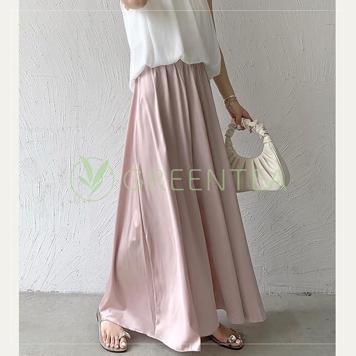 両脇ポケットつきのワイドパンツで、光沢感のある生地が特徴的です。