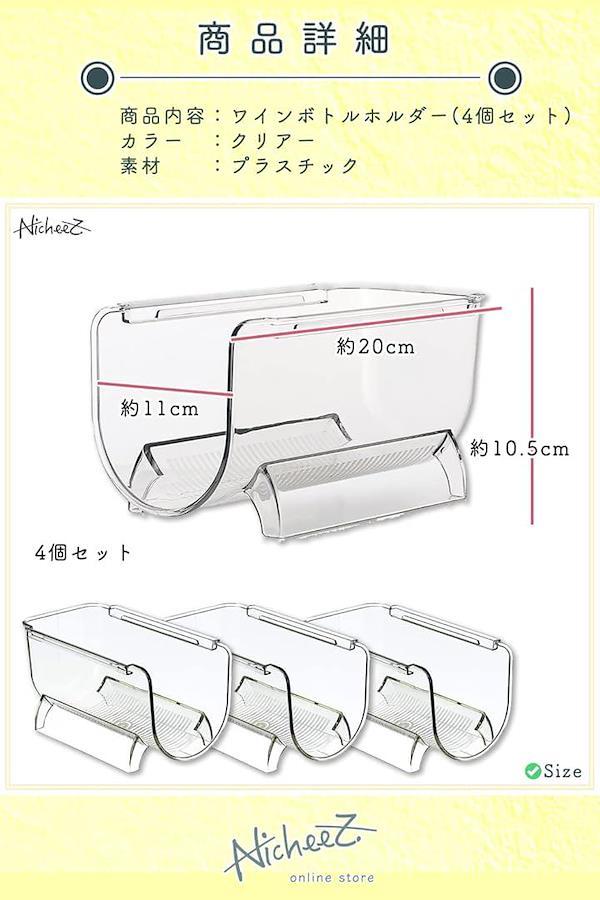 「商品内容」ワインボトルホルダー セット数:4個 カラー:クリア 素材:プラスチック サイズ:高さ/約10.5cm 幅/約11cm 奥行き/約20cm