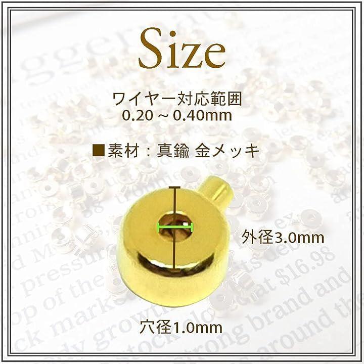 「サイズ・仕様」外径:約3.0mm/内径:約1.0mm、対応ワイヤー径:約0.20mm~0.40mm(テグス・アクセサリーワイヤー対応)、材質:真鍮 金メッキ、カラー:ゴールド(金色)、入数:10個、生産国:日本(Made in Japan)