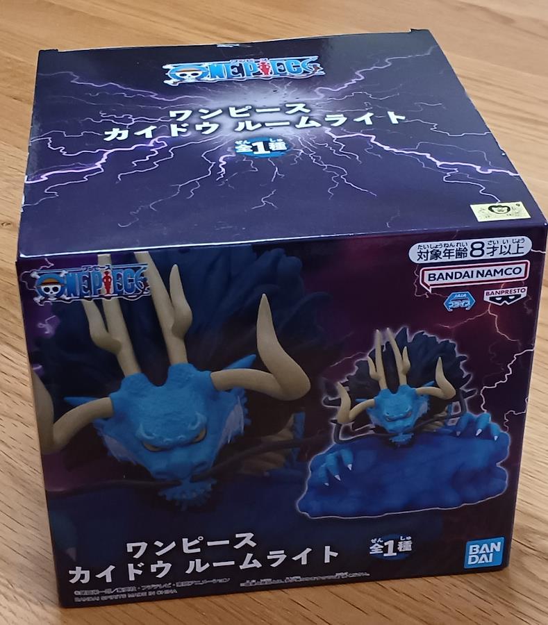 商品はアミューズメント施設で獲得した、手に入りにくい商品です。未開封です。ワンピースの四皇カイドウの龍に変身したフィギュアの電池(別途購入)を入れたら光るルームライトのフィギュアです。