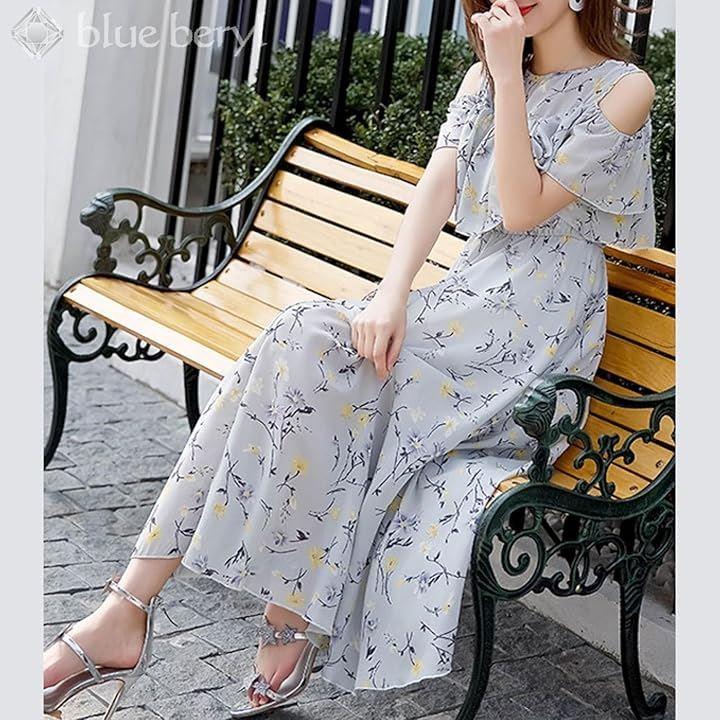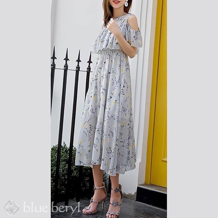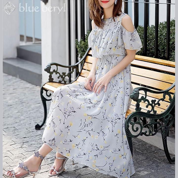 「オープンショルダーが甘さをプラス」 ハイウエストで緩やかなAラインのメリハリのあるシルエットに、胸元のフリルがスイートな華やかさたっぷりのワンピース。