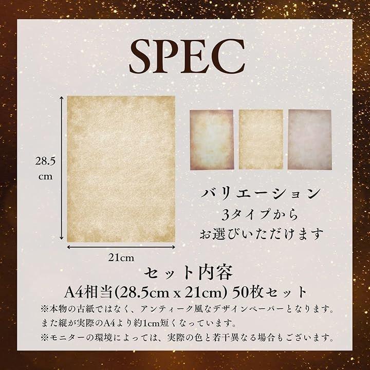 セット内容とサイズ:A4相当(28.5cmx21cm) 50枚セット・本物の古紙ではなく、アンティーク風なデザインペーパーとなります。
