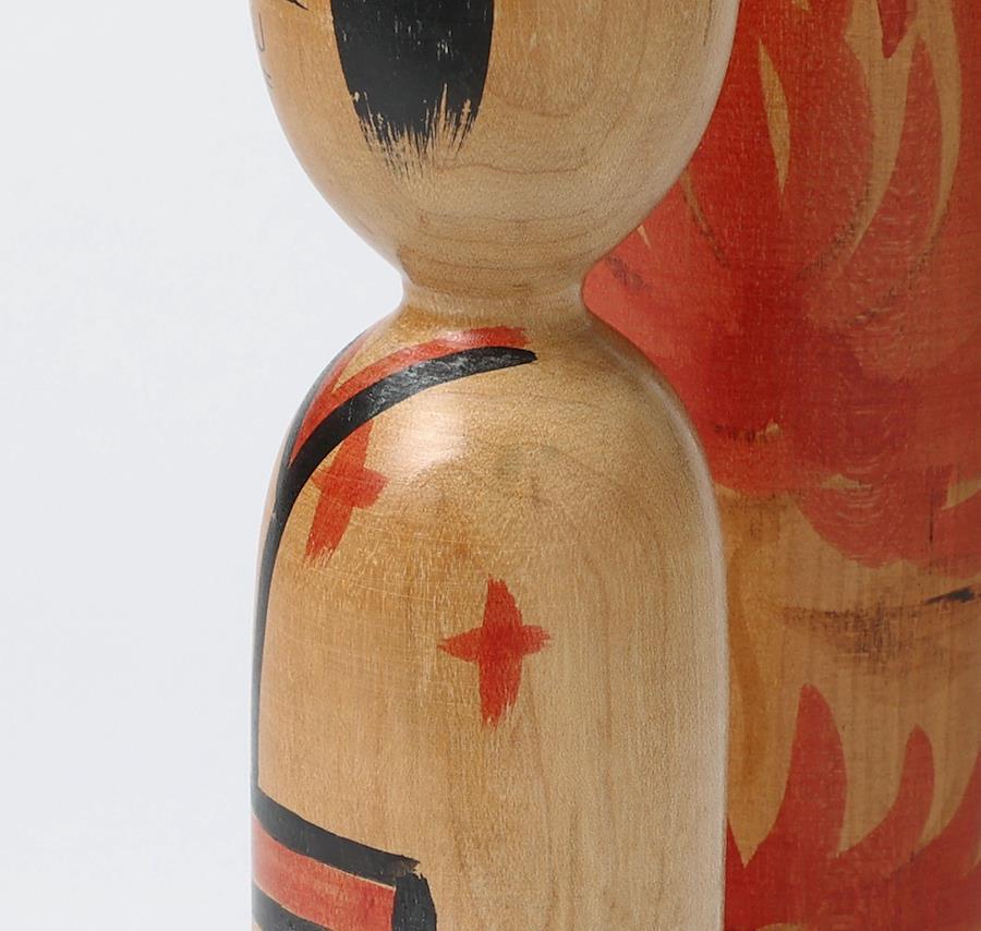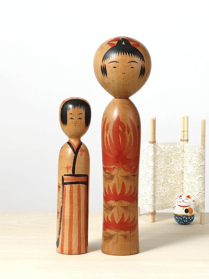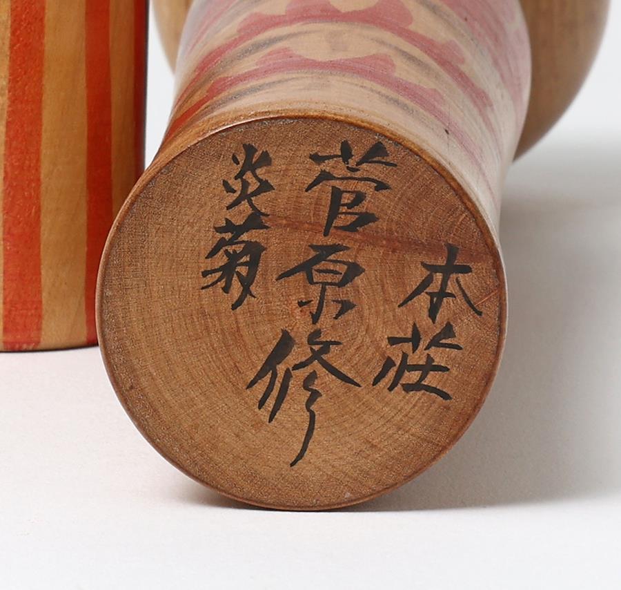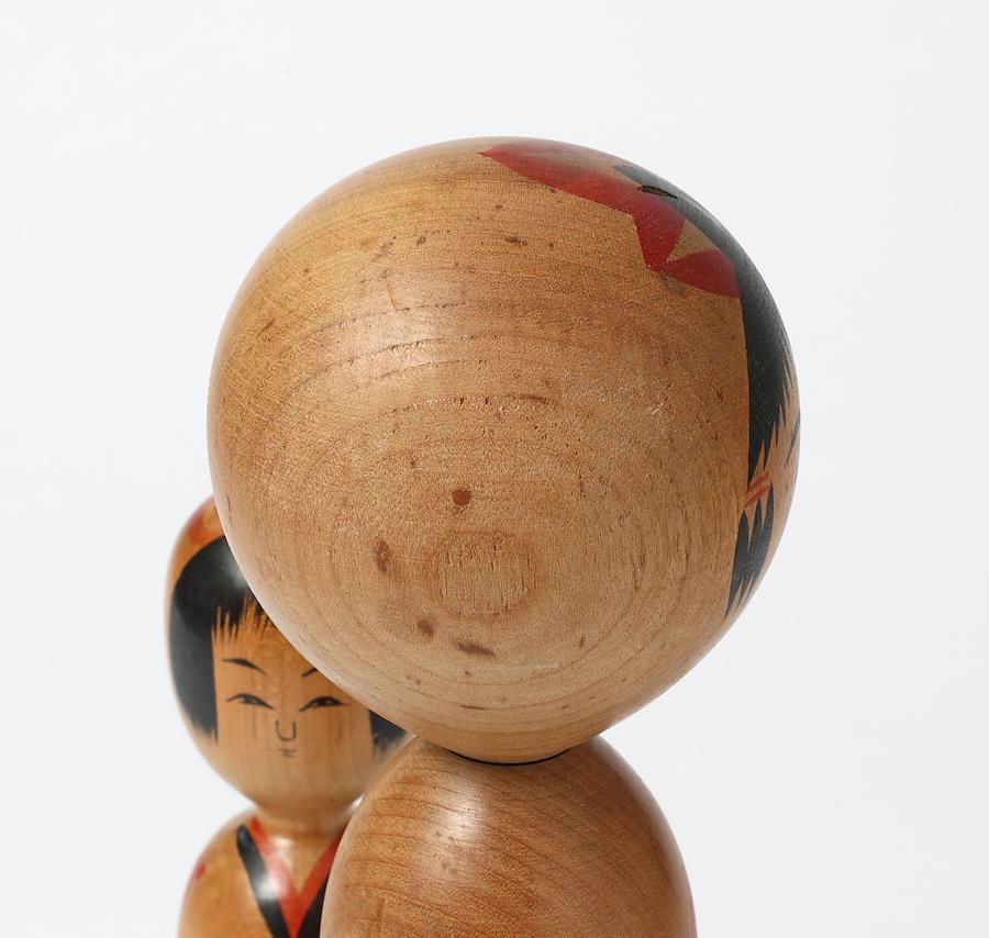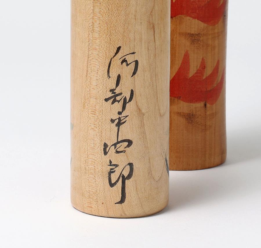 右は鳴子系菅原修工人作で、大きな菊の胴模様がエレガントな印象のこけしです。