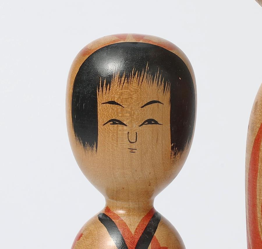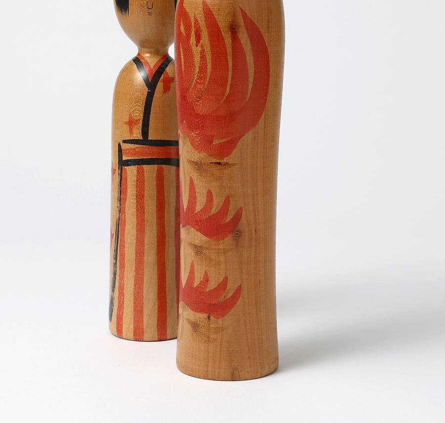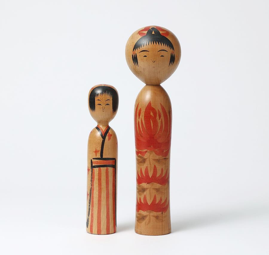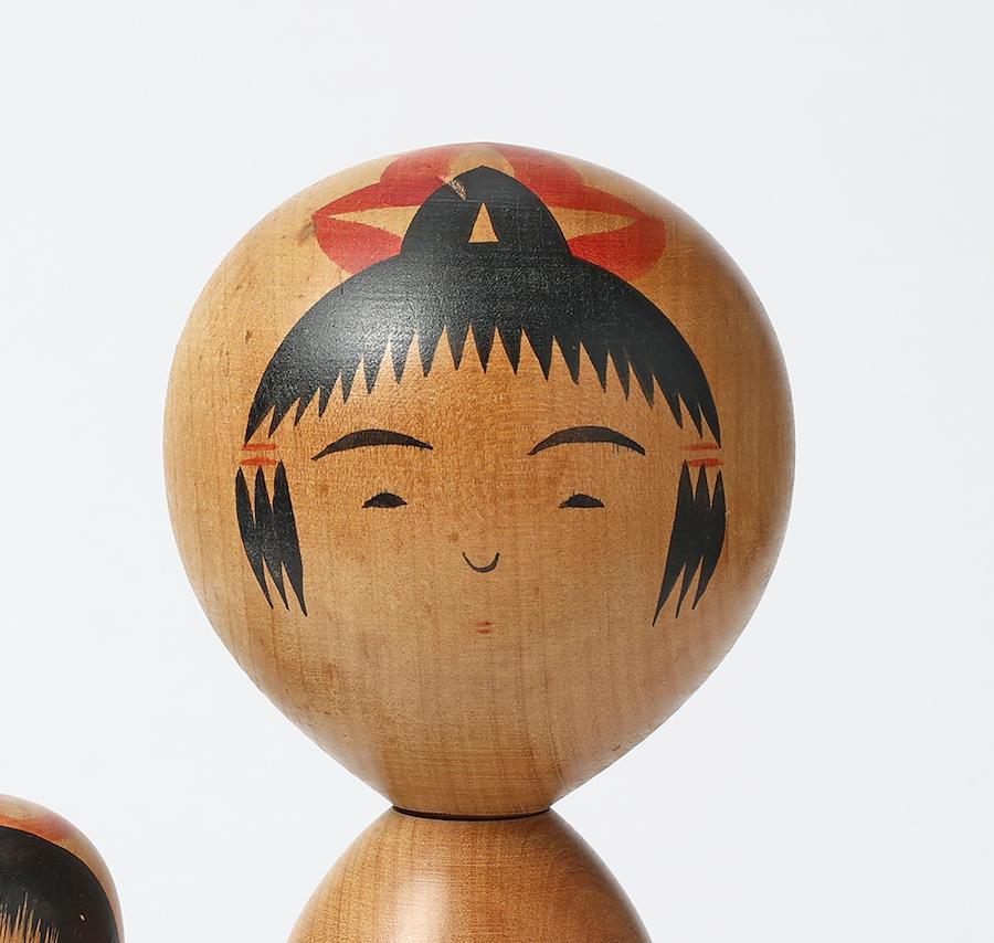 右は鳴子系菅原修工人作で、大きな菊の胴模様がエレガントな印象のこけしです。