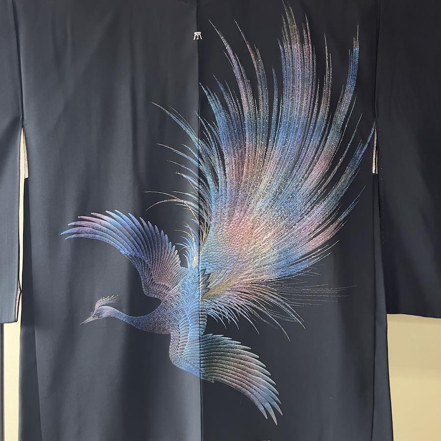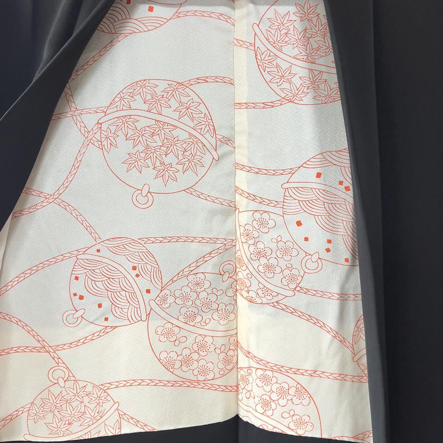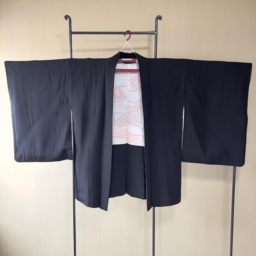 これはヴィンテージの羽織です。こちらは織り出しという技法で生地に色糸で織って柄が描かれています。黒の羽織はデニムやスカートと合わせてドレスアップも楽しみやすく人気な商品です。