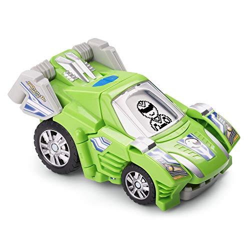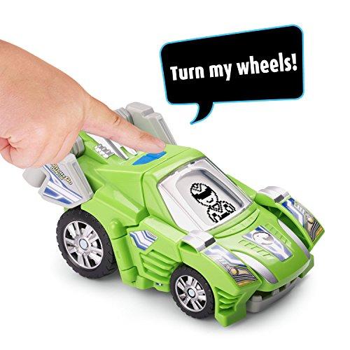 この商品は、1台で2種(恐竜とレーシングカー)が楽しめる玩具です。恐竜の目やレーサータイプはボタンで選択できます。T-REXの迫力ある声は『 No one can roar louder than me 』『 I have 60 teeth and some are as long as knives.』と言ったり、レースカーに変身したらレーサーが『 Start your engine』と言って、エンジン音とともに気分も盛り上がります。