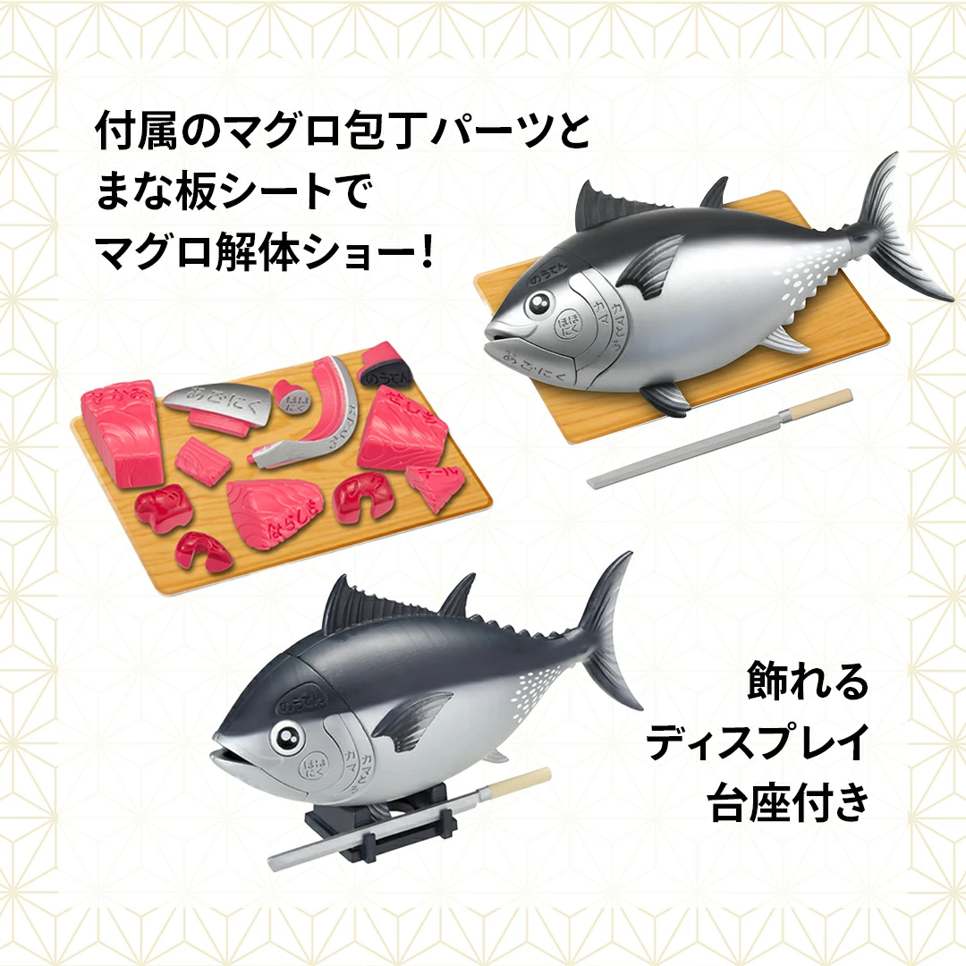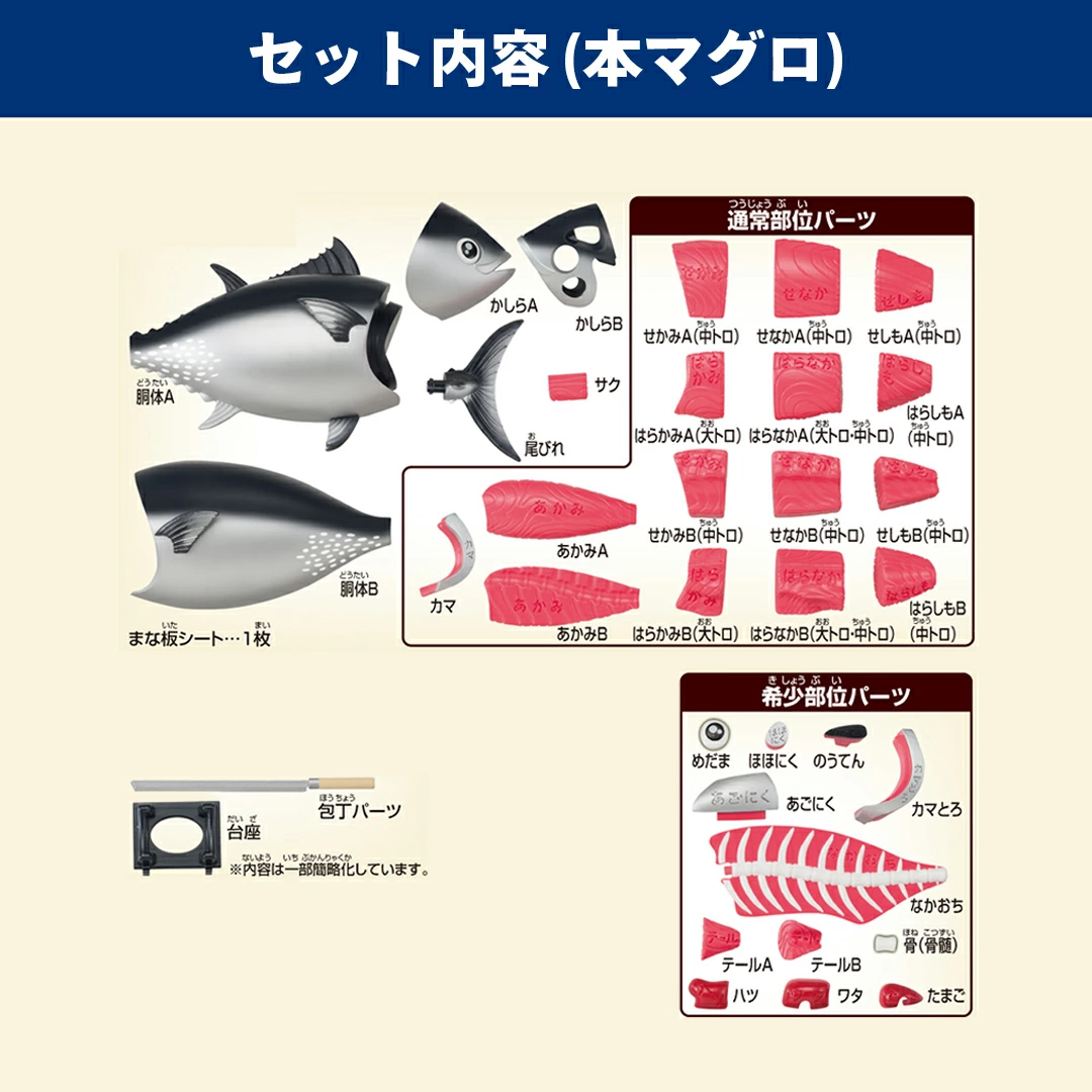 【セット内容】胴体A、胴体B、かしらA、かしらB、尾びれ、サク通常部位パーツ:せかみA(中トロ)、せかみB(中トロ)、せなかA(中トロ)、せなかB(中トロ)、せしもA(中トロ)、せしもB(中トロ)、はらかみA(大トロ)、はらかみB(大トロ)、はらなかA(大トロ・中トロ)、はらなかB(大トロ・中トロ)、はらしもA(中トロ)、はらしもB(中トロ)、あかみA、あかみB、カマ希少部位パーツ:めだま、ほほにく、のうてん、あごにく、カマとろ、なかおち、テールA、テールB、骨(骨髄)、ハツ、ワタ、たまご台座、包丁パーツ、まな板シート×1枚※本マグロにはシャリパーツは付属しておりません。