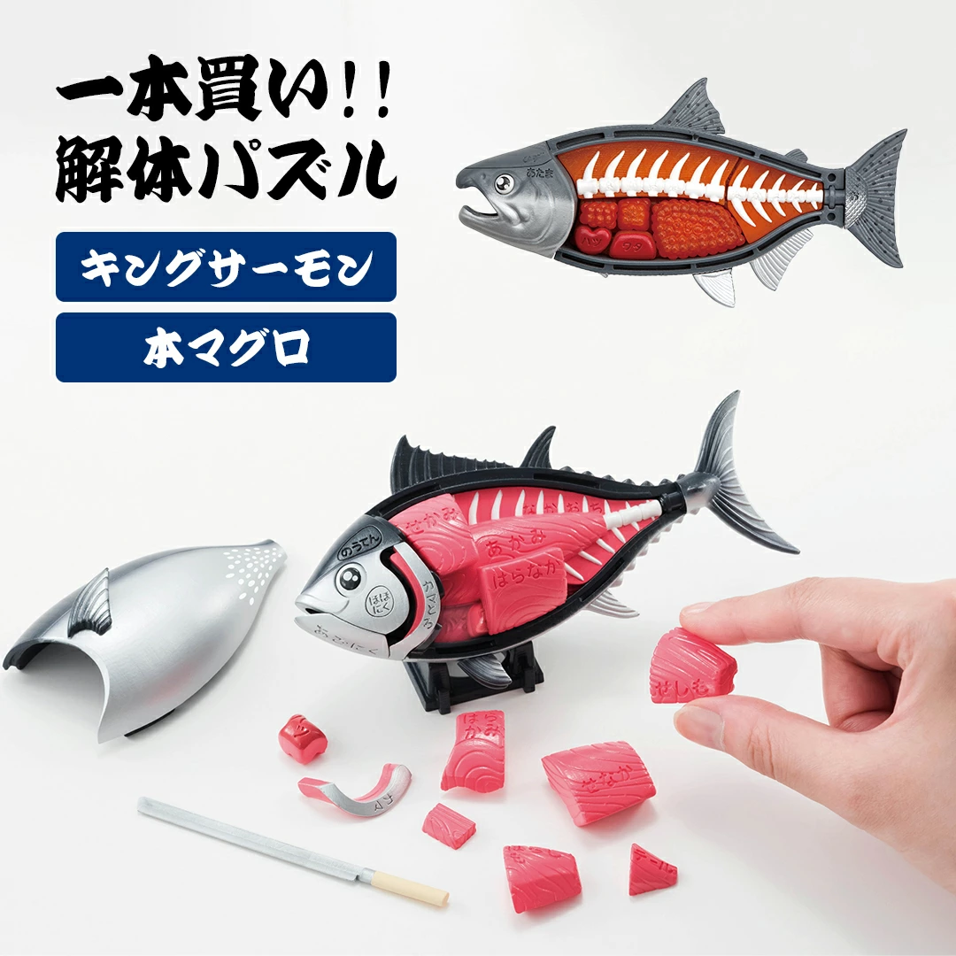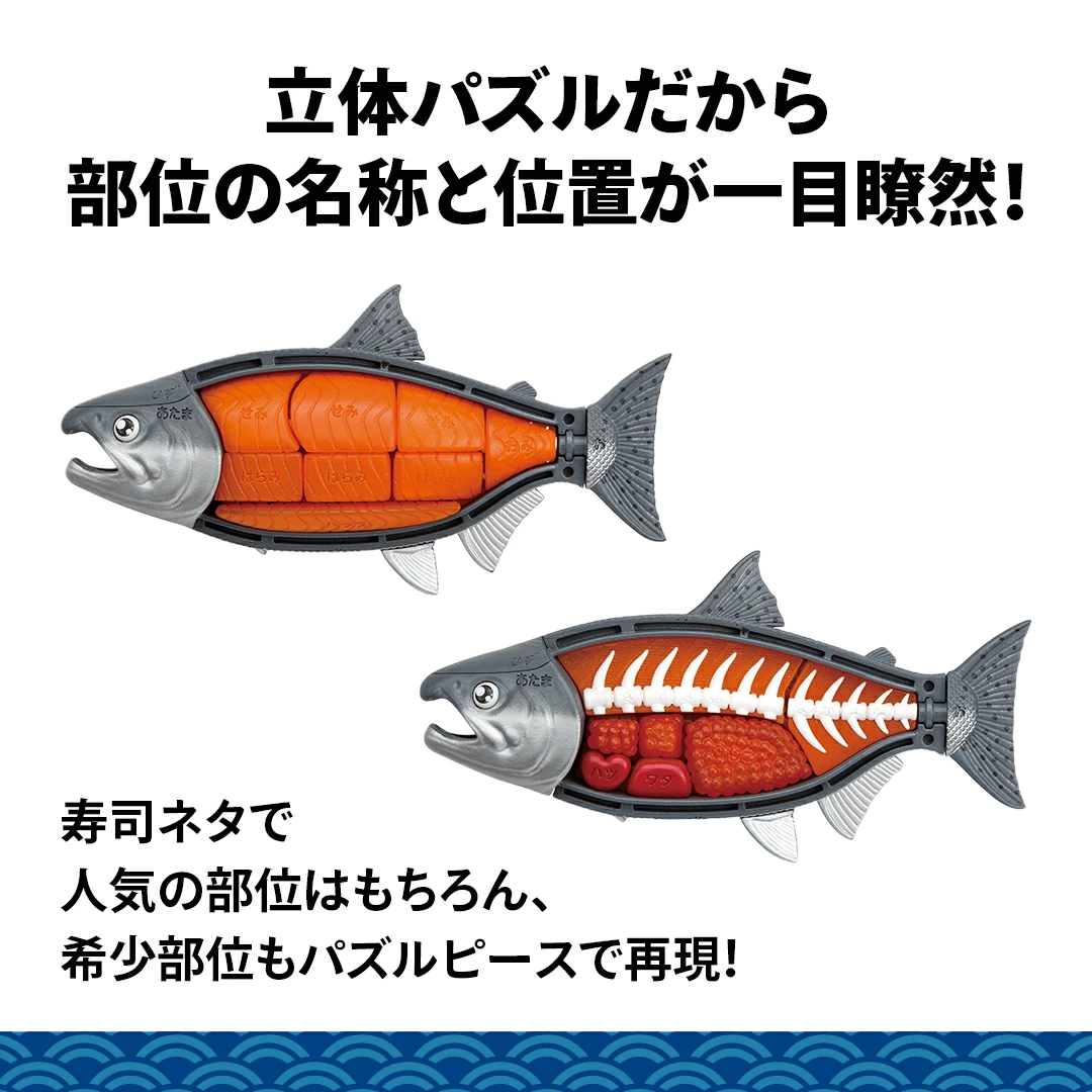【商品情報】●遊んで学べ、お寿司も作れる?!「キングサーモンの部位がわかるパズル」が登場!ばらばらの34パーツを組んでキングサーモンを完成させよう!●寿司ネタで人気の「み」がとれる「せみ」「はらみ」はもちろん、希少部位の「ハラス」「すじこ」もパズルピースとして再現しています。●立体パズルだから部位の名称と位置が一目瞭然でわかります。●包丁パーツとまな板シートを使って遊んだり、しゃりパーツと組み合わせると「お寿司」を作れたり遊びごたえ抜群!●遊び終わったら飾れるディスプレイ台座付き!