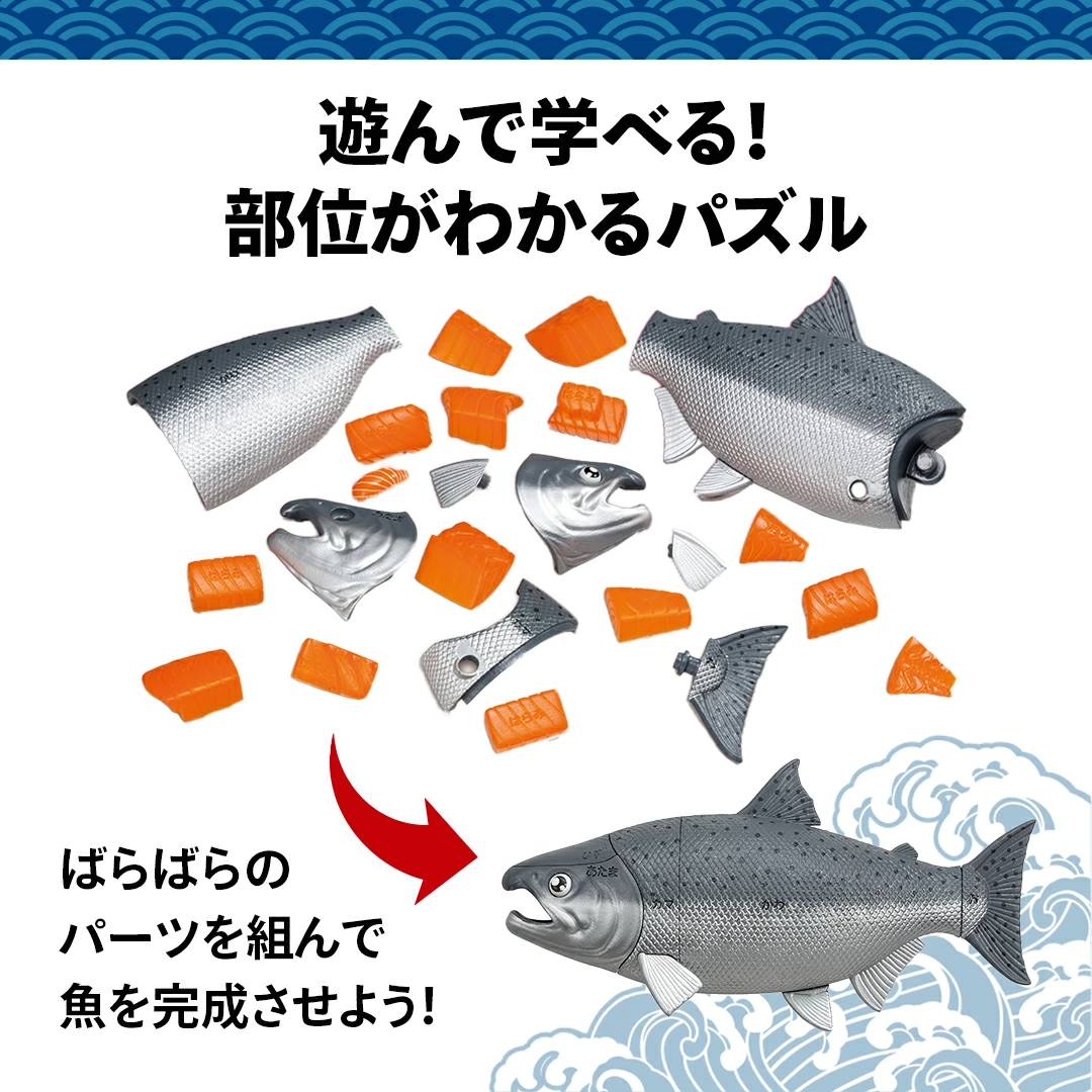 【商品情報】●遊んで学べ、お寿司も作れる?!「キングサーモンの部位がわかるパズル」が登場!ばらばらの34パーツを組んでキングサーモンを完成させよう!●寿司ネタで人気の「み」がとれる「せみ」「はらみ」はもちろん、希少部位の「ハラス」「すじこ」もパズルピースとして再現しています。●立体パズルだから部位の名称と位置が一目瞭然でわかります。●包丁パーツとまな板シートを使って遊んだり、しゃりパーツと組み合わせると「お寿司」を作れたり遊びごたえ抜群!●遊び終わったら飾れるディスプレイ台座付き!