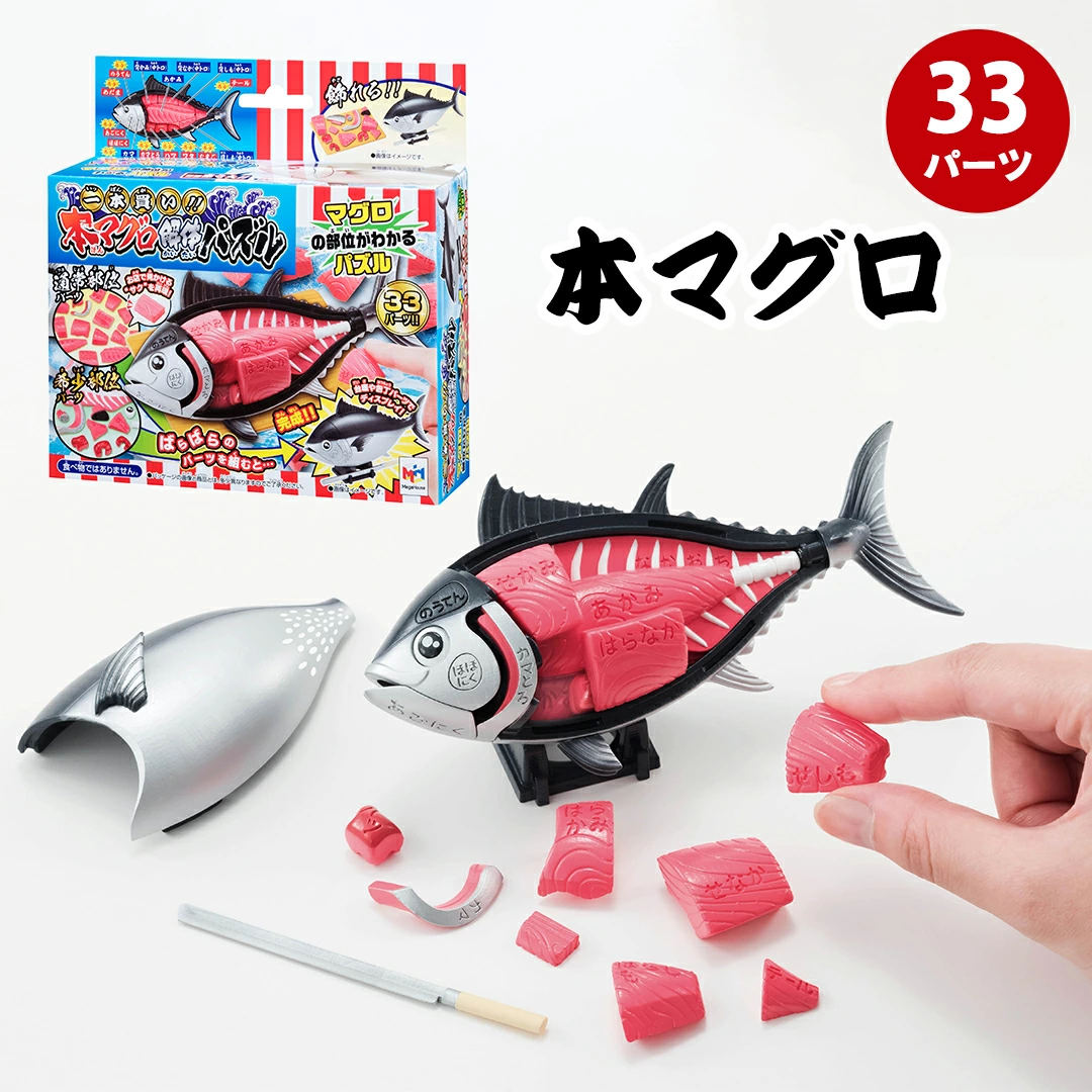 【商品情報】●遊んで学べる「マグロの部位がわかるパズル」が登場!ばらばらの33パーツを組んで本マグロを完成させよう!●寿司ネタで人気の大トロや中トロが取れる部位「かみ」「なか」「しも」はもちろん、1体からわずかしか取れない希少部位もパズルピースとして再現しています。●各パーツには部位の名前が彫刻(ちょうこく)されているため、「部位の名称」が見てすぐにわかります。●付属のマグロ包丁パーツとまな板シートを使えばマグロ解体ショー気分で遊べます!●ディスプレイ用台座も付いています。