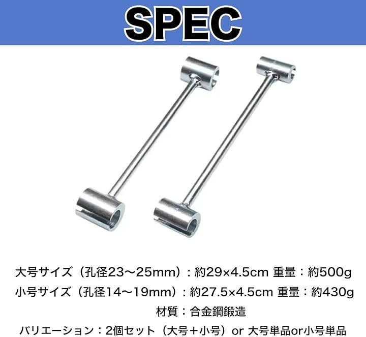 「商品仕様」2個セット、大号サイズ(孔経23~25mm) : 約29x4.5cm(重量 : 約500g)/ 小号サイズ(孔経14~19mm ) : 約27.5x4.5cm(重量 : 約430g)/ 材質 : 合金鋼鍛造 *モニターの環境により、色の見え方に若干差が生じる場合がございます。