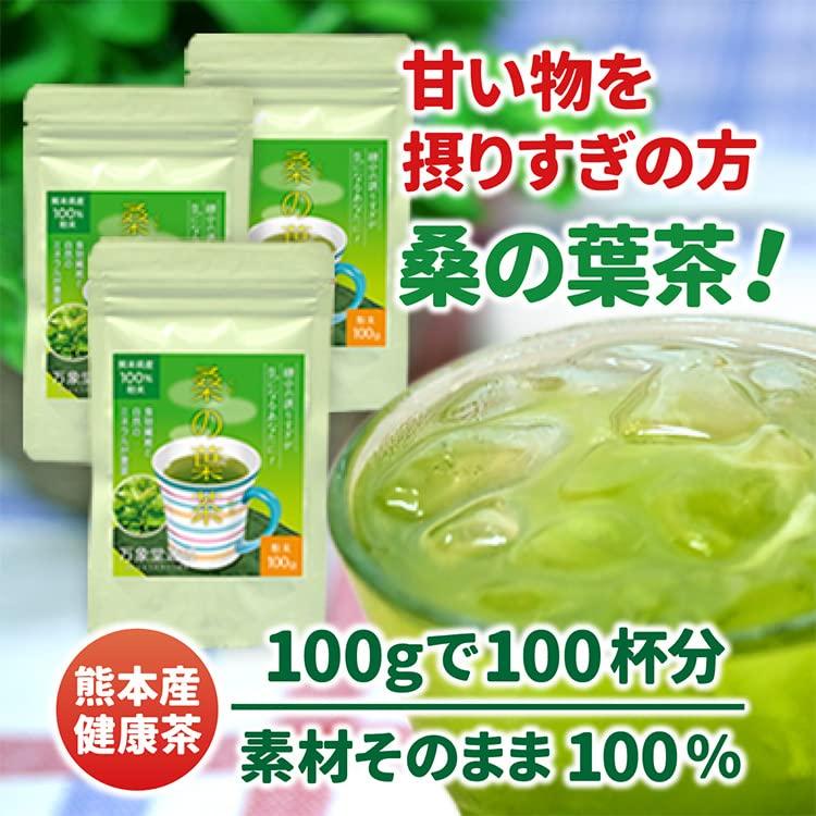 桑の葉茶国産だから安心安全。粉末100g入り×3。カップ(200cc)100杯分の桑の葉茶がお飲み出来ます。「つい甘い物を食べ過ぎる方に!」桑の葉にはDNJが含まれています。食物繊維も豊富なおススメの健康茶です。自然の恵みそのままの青汁風味です。専用スプーン付。当社売り上げNO1。粉末で簡単、便利。いつでもどこでも、お湯や水を注ぐだけでお飲みになれます。※原料産地・熊本県下益城(しもましき)郡・美里(みさと)町 ※加工・封入宇城(うき)市で行っています。完全無添加 桑の葉100%パウダー※賞味期限・常温未開封1年。