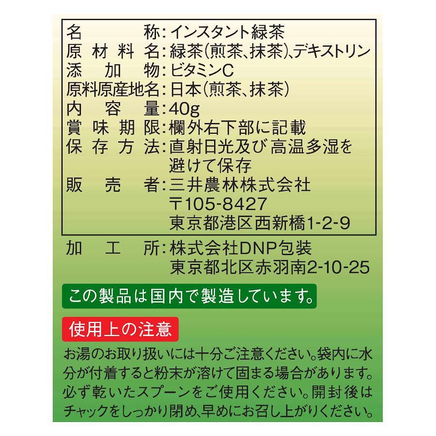 内容量:40g×2個カロリー:3kcal(0.7gあたり)水でもお湯でもすぐ溶けます。宇治抹茶入り、国産茶葉を100%使用。カフェインを気にせず飲めるインスタント緑茶です。【免責事項】メーカーによる商品リニューアルに伴いパッケージ(内容量も含む)変更が行われた場合、新パッケージでお届け致します事ご了承願います。