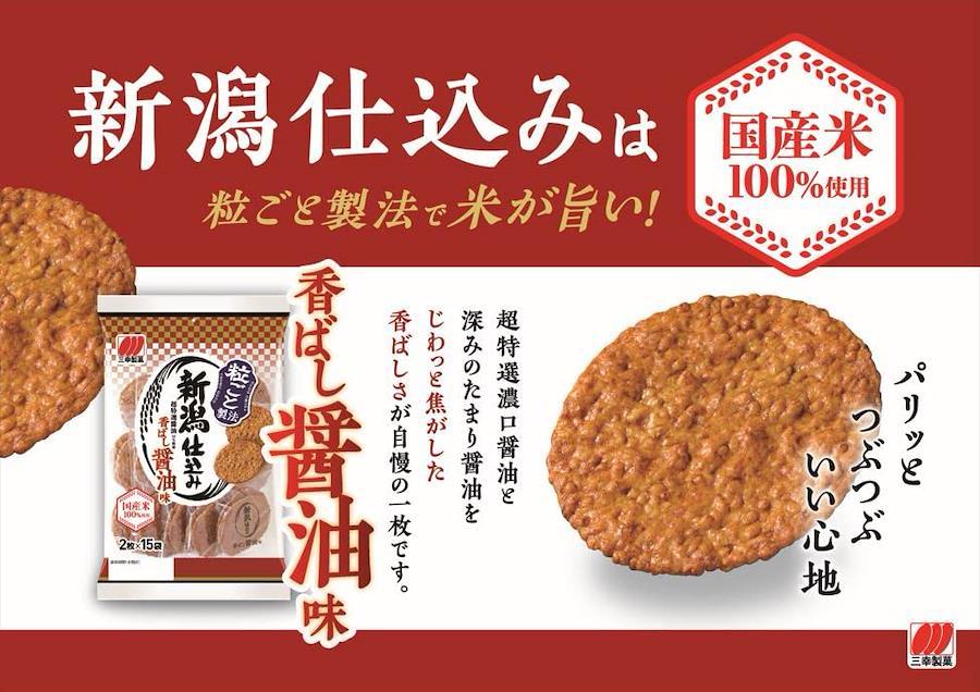 原材料:米(国産)、しょうゆ(小麦・大豆を含む)、でん粉、砂糖、デキストリン、発酵調味料、食塩、唐辛子/ソルビトール、調味料(アミノ酸等)、着色料(カラメル、パプリカ色素)、乳化剤