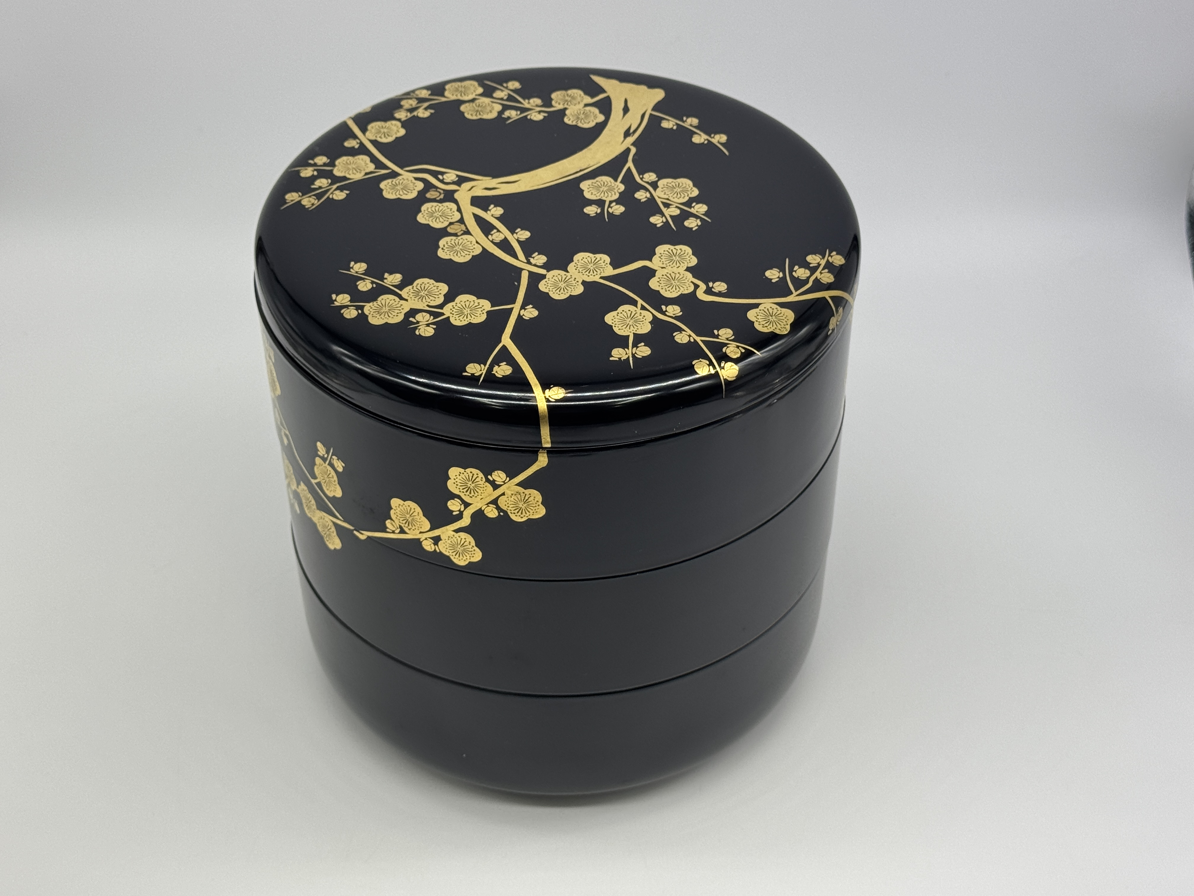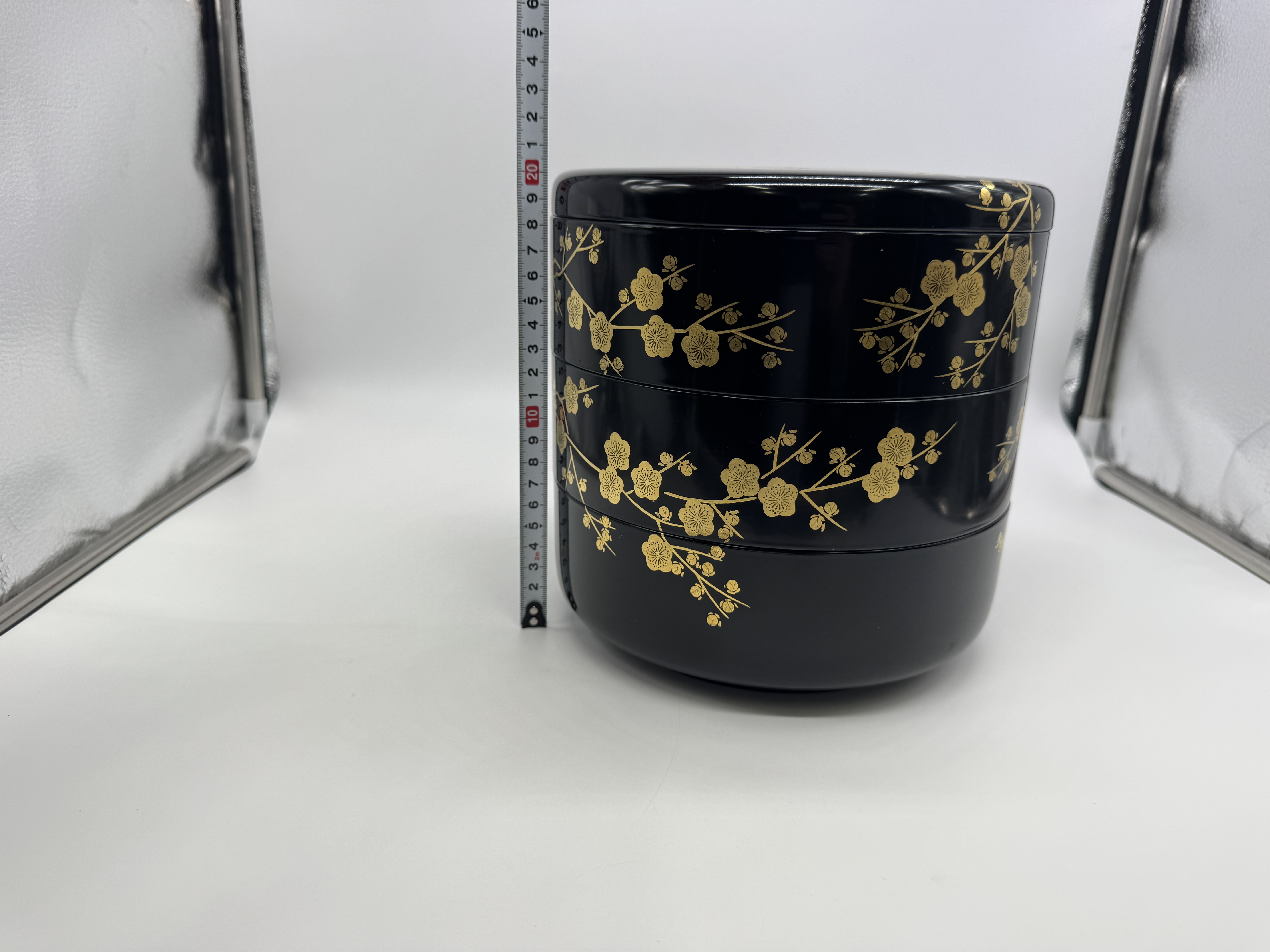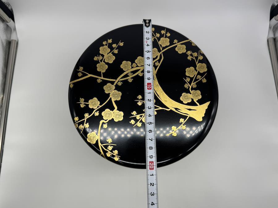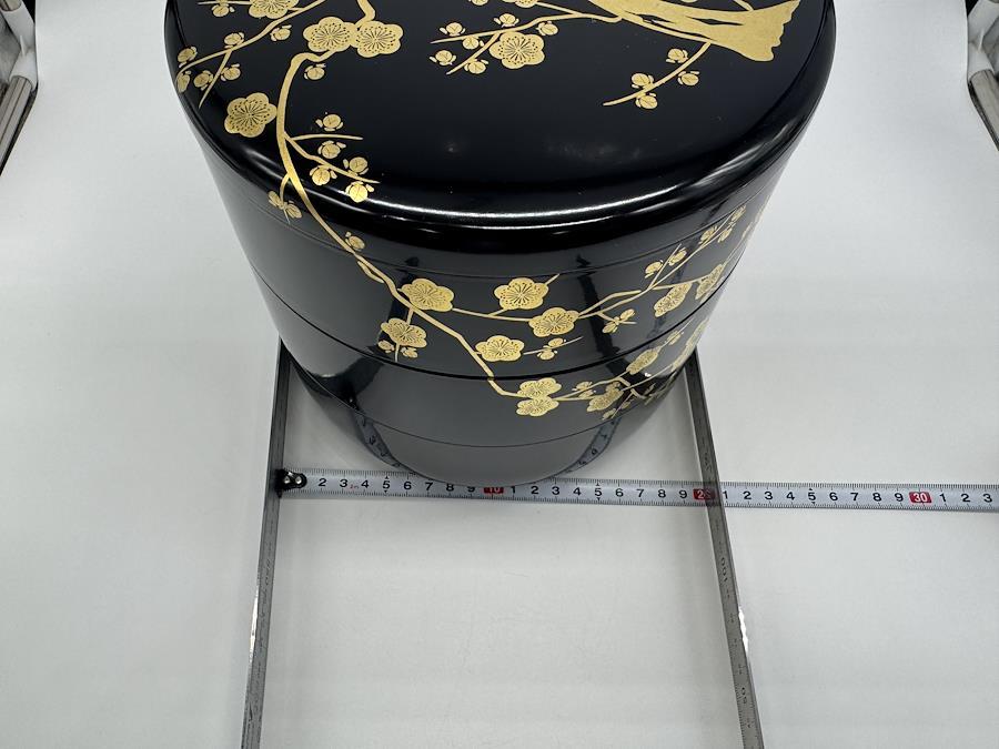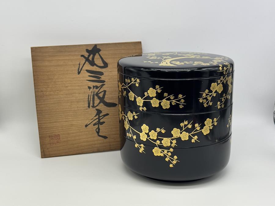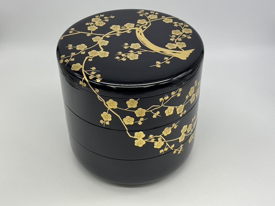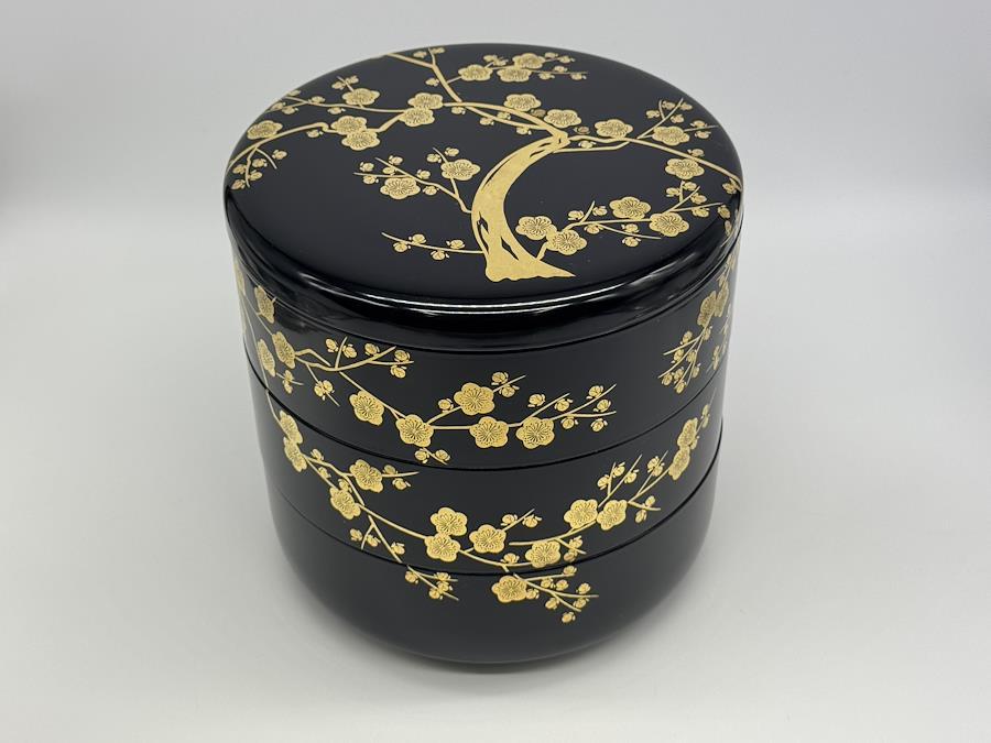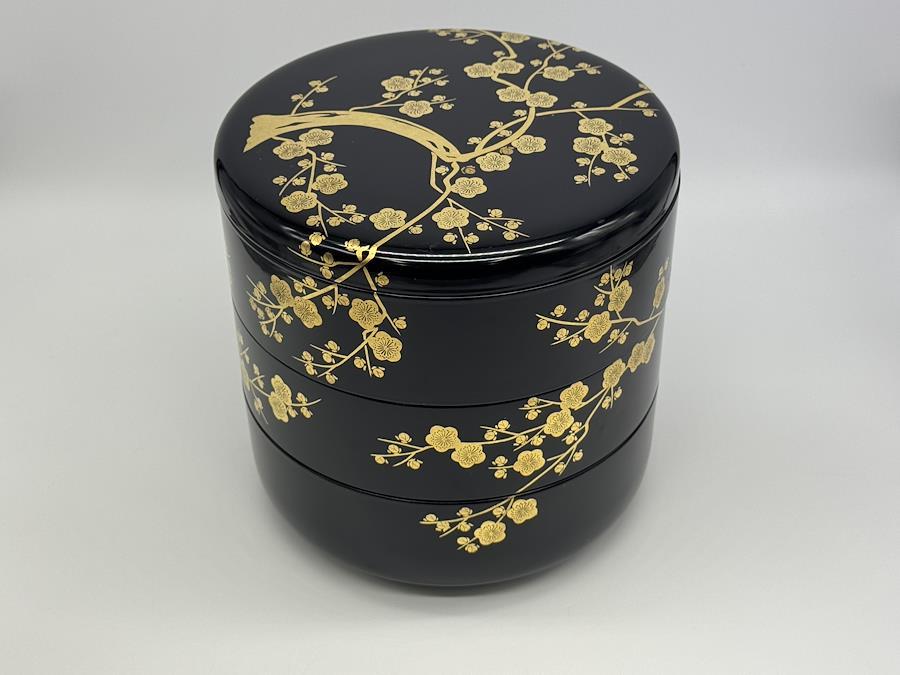 日本のおかずなどを入れる昔ながらの容器です。鏡餅のように筒状で丸い形をした3段重ねのお重箱のことで、おせち料理などで使われ、「幸せを重ねる」という意味を持つ重箱の一種です。