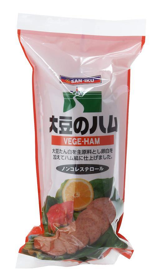 「大豆のハム」は、健康を心がけている方のために、大豆たん白を主原料に卵白を加えて作られたハム風の植物性たん白食品です。料理の素材として、和・洋・中華などのどんな料理にもよく合いおいしく召し上がれます。動物油脂、肉エキス、肉フレーバーなどは使用しておりません。保存料、殺菌料は使用しておりません。
