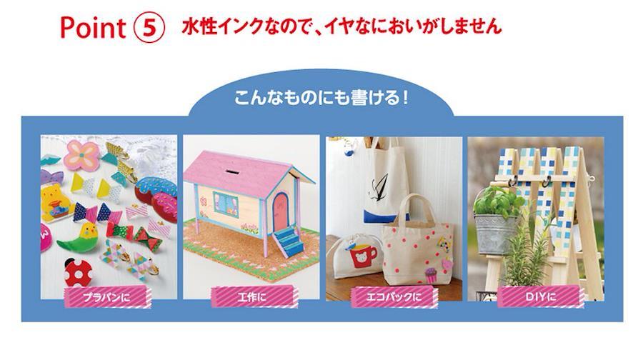 耐水性に優れていて、水にも強い水性マーカーです。ポスターカラーのように鮮やかに発色し、素材を侵すことがなく、嫌なニオイもありません。