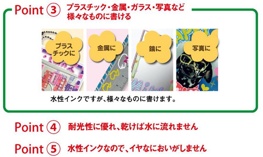 乾くと重ね書きもでき、金属、ガラス、プラスチック、鏡など様々なものに書けます。