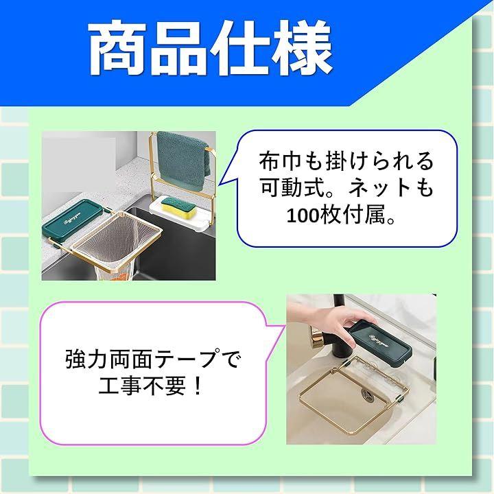 強力な固定力を持つホルダーと、100枚の使い捨て水切りネットがセットになっており、ゴミや食材くずをしっかりキャッチします。