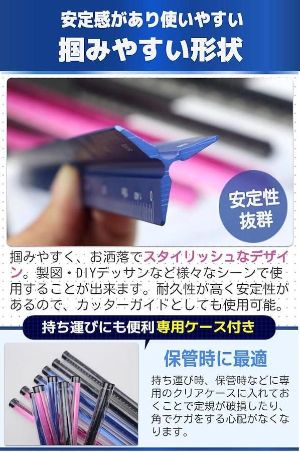 「商品特徴」 丈夫なアルミ合金製:軽くて頑丈。滑らかな触り心地で使いやすい ミリ単位の目盛り:精密な目盛で細かい作業にも最適 専用ケース付き:お洒落な見た目で持ち運びにも便利 選べる2種類の長さ:15cm/30cmの2種類の長さ