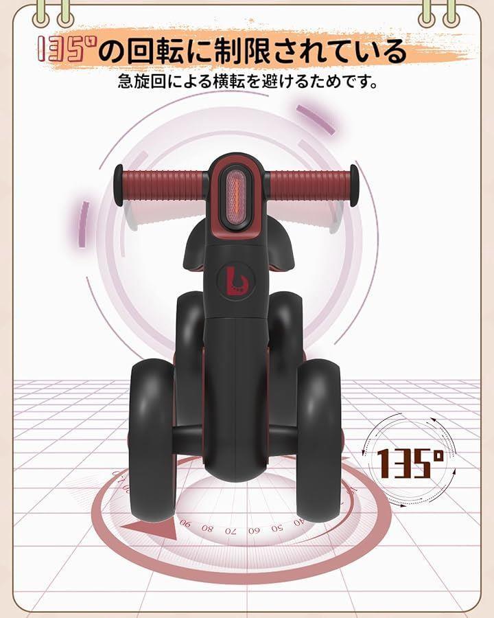 子供用三輪車の前輪には重力ステアリングがついていて、前の方は135°の回転に制限されているので、赤ちゃんが走行中に障害物にぶつかったり、路面が荒れていても転倒を防ぐことができます。