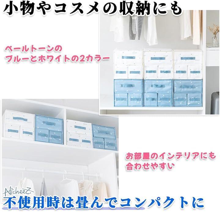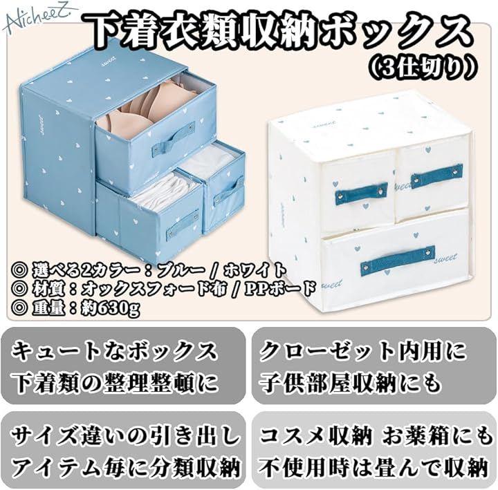 「商品内容」 下着衣類収納ボックス(3仕切り) 材質:オックスフォード布/PPボード カラー:ホワイト/ブルー サイズ:幅/約29cm 奥行き/約22cm 高さ/約28cm 重量:約630g