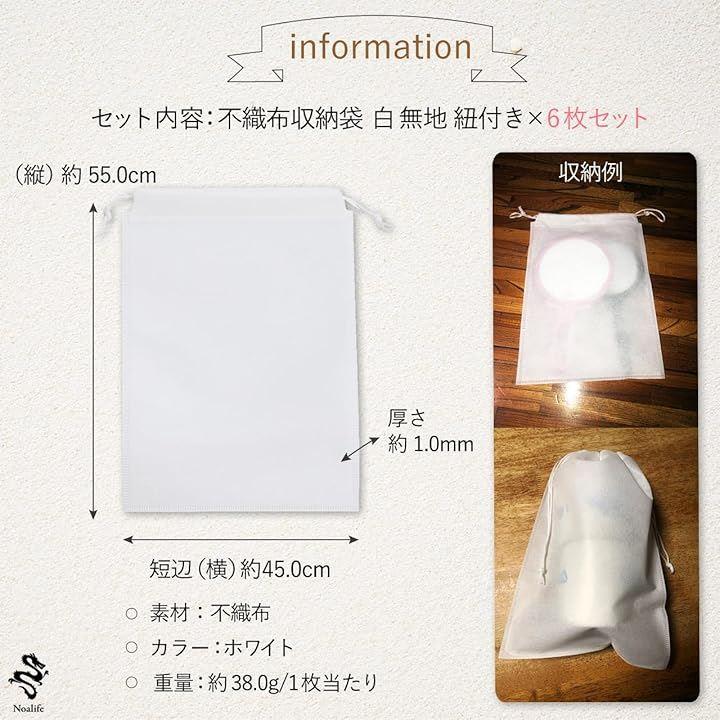 「商品仕様」セット内容:不織布収納袋 巾着袋 白 無地 紐付きx6枚セット サイズ(外寸):長辺(縦) 約55.0cm , 短辺(横) 約45.0cm 厚さ 約1.0mm 重量:約38.0g/1枚当たり 素材:不織布 カラー:ホワイト *モニターの環境等により、色の見え方に若干差が生じる場合がございます。
