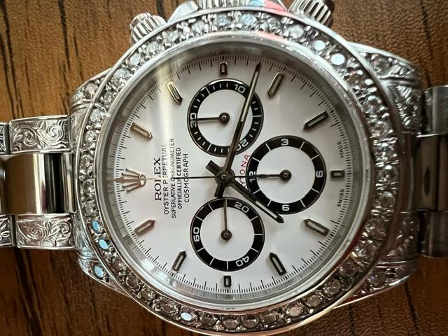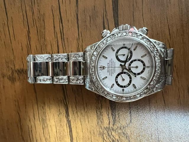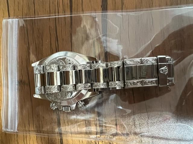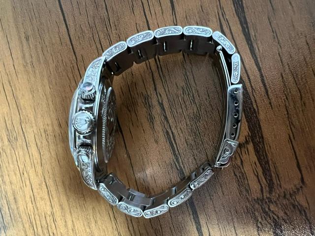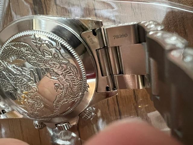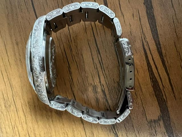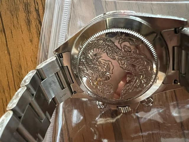 ベゼルに天然ダイヤモンドを入れブレスとケース全体に模様を彫り、裏蓋にドラコンをデザインしました