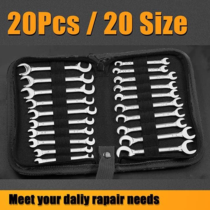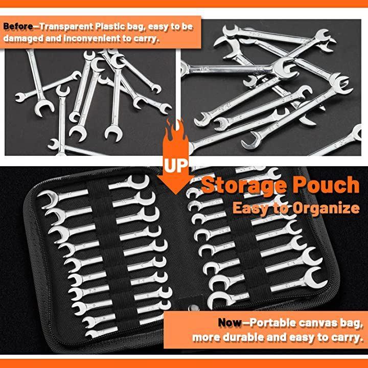 「商品内容」 10個メトリックレンチ サイズ4mm、4.5mm、5mm、5.5mm、6mm、7mm、8mm、9mm、10mm、11mm;10個SAEレンチ サイズ5/32インチ、3/16インチ、13/64インチ、7/32インチ、15/64インチ、1/4インチ、9/32インチ、5/16インチ、3/8インチ、7/16インチ;サイズ識別を容易にするために仕様書はハンドル両側に刻印している;1xストレージポーチです。
