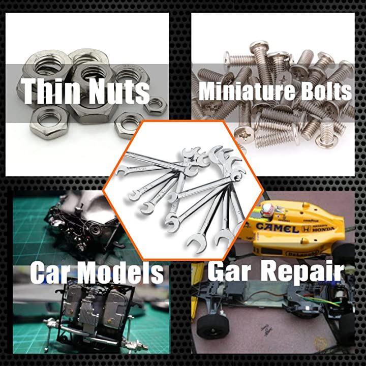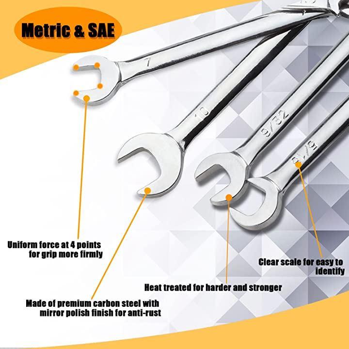パッケージ内容:10枚の公制スパナのサイズを含む4mm、4.5mm、5mm、5.5mm、6mm、7mm、8mm、9mm、10mm、11mm;10点セットSAEレンチサイズ5/32、3/16、13/64、7/32、15/64、1/4、9/32、5/16、3/8、7/16;1つの物入れ;材料:高品質の炭素鋼を采用;表面処理:鏡面整理;注意:1。