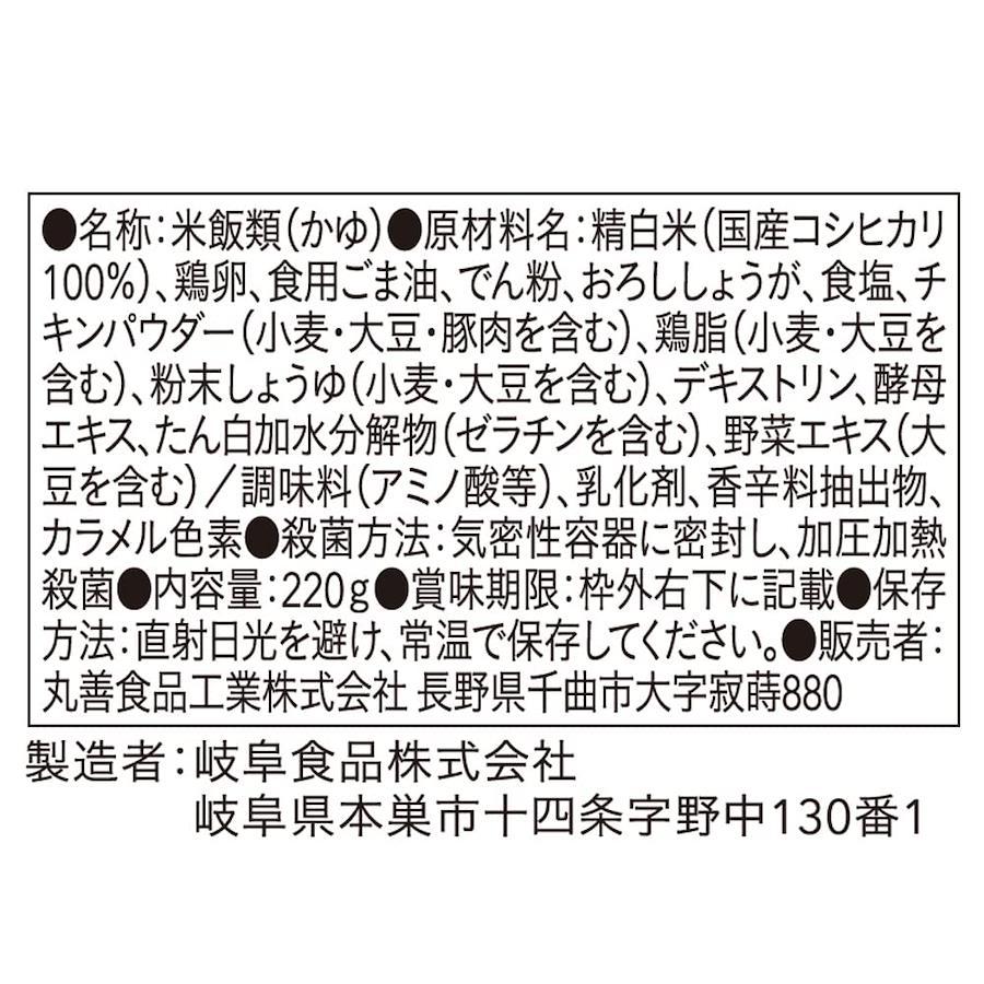 原材料:精白米(国産コシヒカリ100%)、鶏卵、食用ごま油、でん粉、おろししょうが、食塩、チキンパウダー(小麦・大豆・豚肉を含む)、鶏脂(小麦・大豆を含む)、粉末しょうゆ(小麦・大豆を含む)、デキストリン、酵母エキス、たん白加水分解物(ゼラチンを含む)、野菜エキス(大豆を含む)/調味料(アミノ酸等)、乳化剤、香辛料抽出物、カラメル色素内容量:220g×12カロリー:110kcal商品サイズ(高さx奥行x幅):19cm×19.7cm×26.6cm【重要】メーカーによる商品リニューアルに伴いパッケージ(内容量も含む)変更が行われた場合、新パッケージでお届け致します事ご了承願います。