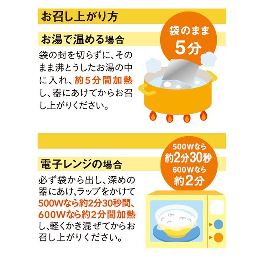 『お召し上がり方』●お湯で温める場合→袋の封を切らずに、そのまま沸とうしたお湯の中に入れ、約5分間加熱し、器にあけてからお召し上がりください。●電子レンジの場合→必ず袋から出し、深めの器にあけ、ラップをかけて500Wなら約2.5分間、600Wなら約2分間加熱し、軽くかき混ぜてからお召し上がりください。