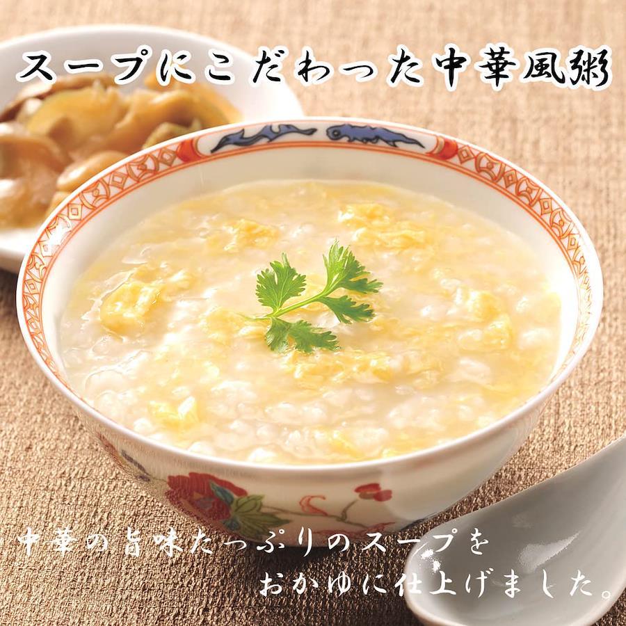 中華の旨味たっぷりのスープをおかゆに仕上げました。ふんわり卵を加えた食べ応えのある味わいです。主食としてはもちろんですが、朝食や夜食、ダイエット、万が一の防災準備品など、色々なシーンでご利用戴けます。(温めずにそのままでもお召し上がりいただけます。)国内産コシヒカリ100%使用。110kcal。本品1袋:220gあたり エネルギー110kcal,たんぱく質 2.2g,脂質3.5g, 炭水化物17.4g,食塩相当量1.3g