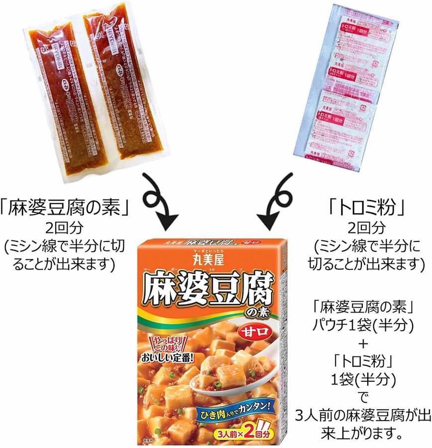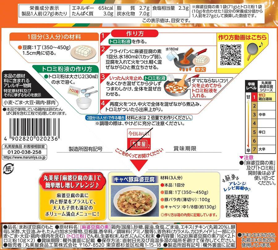 原材料:[麻婆豆腐の素]鶏肉(国産)、砂糖、醤油、食塩、ごま油、エキス(チキン(丸鶏20%)、酵母)、米酢、大豆油、みそ、たん白加水分解物、豆板醤、香辛料/調味料(アミノ酸等)、着色料(カラメル、カロチノイド)、(一部に小麦・ごま・大豆・鶏肉・豚肉を含む)|[トロミ粉]でん粉、生姜粉末、ねぎ、にんにく粉末